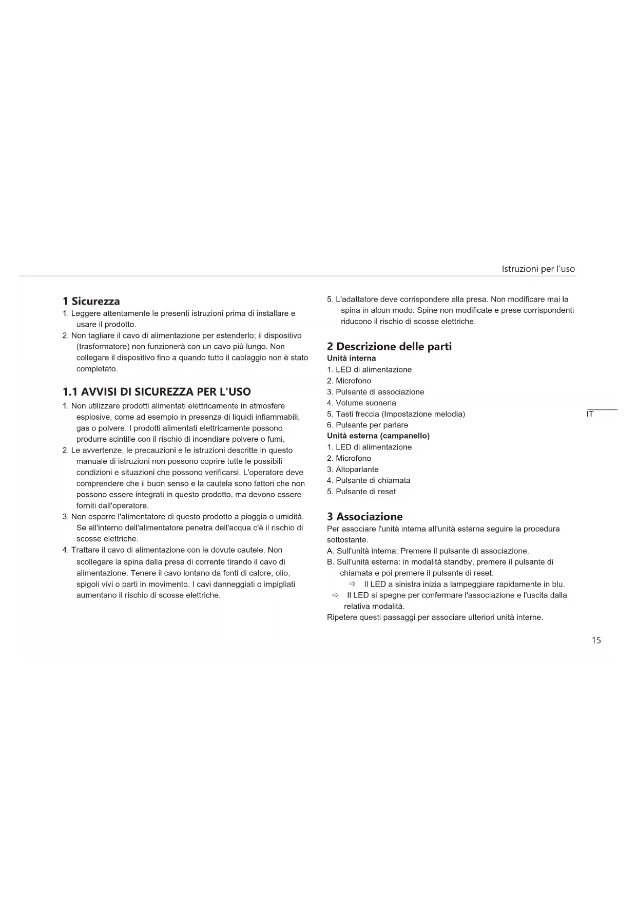 3 Associazione Per associare l'unità interna all'unità esterna seguire la procedura sottostante. A. Sull'unità interna: Premere il pulsante di associazione. B. Sull'unità esterna: in modalità standby, premere il pulsante di chiamata e poi premere il pulsante di reset. ð Il LED a sinistra inizia a lampeggiare rapidamente in blu. ð Il LED si spegne per confermare l'associazione e l'uscita dalla relativa modalità. Ripetere questi passaggi per associare ulteriori unità interne. ITIstruzioni per l'uso