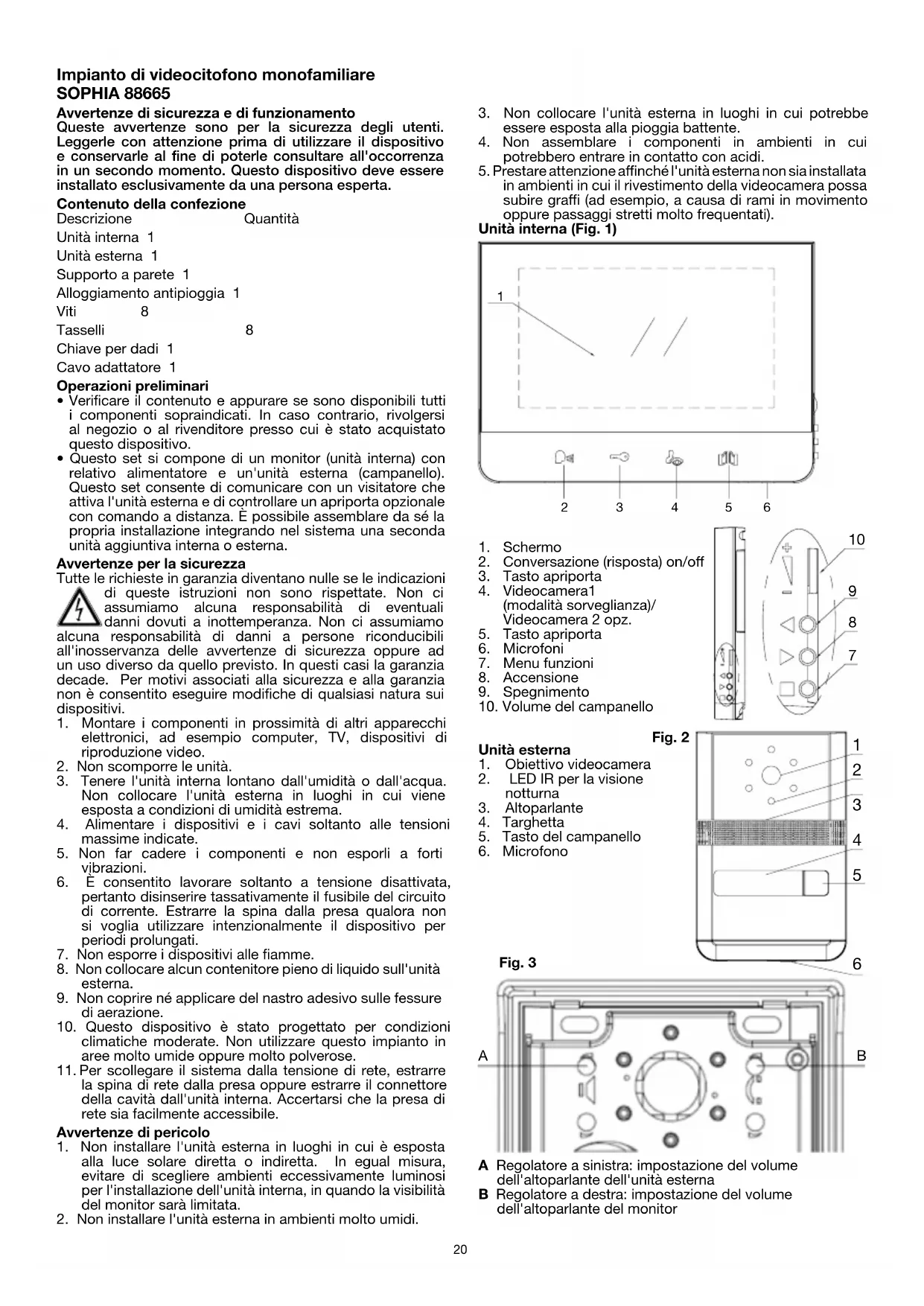 nuovamente entrambe le viti sul lato inferiore. Erogare l'alimentazione elettrica del sistema soltanto quando l'unità esterna è già cablata con l'unità interna. Accertarsi della corretta polarità dei collegamenti! Installazione/Impostazione dell'unità esterna È possibile configurare due impostazioni all'interno dell'unità esterna. In alto a sinistra è possibile regolare il volume dell'altoparlante dell'unità esterna (Fig. 3A), in alto a destra il volume dell'altoparlante dell'unità interna (Fig. 3B). Per modificare le impostazioni, utilizzare ad esempio un cacciavite e ruotare i regolatori senza esercitare una forza eccessiva. Scritta sulla targhetta