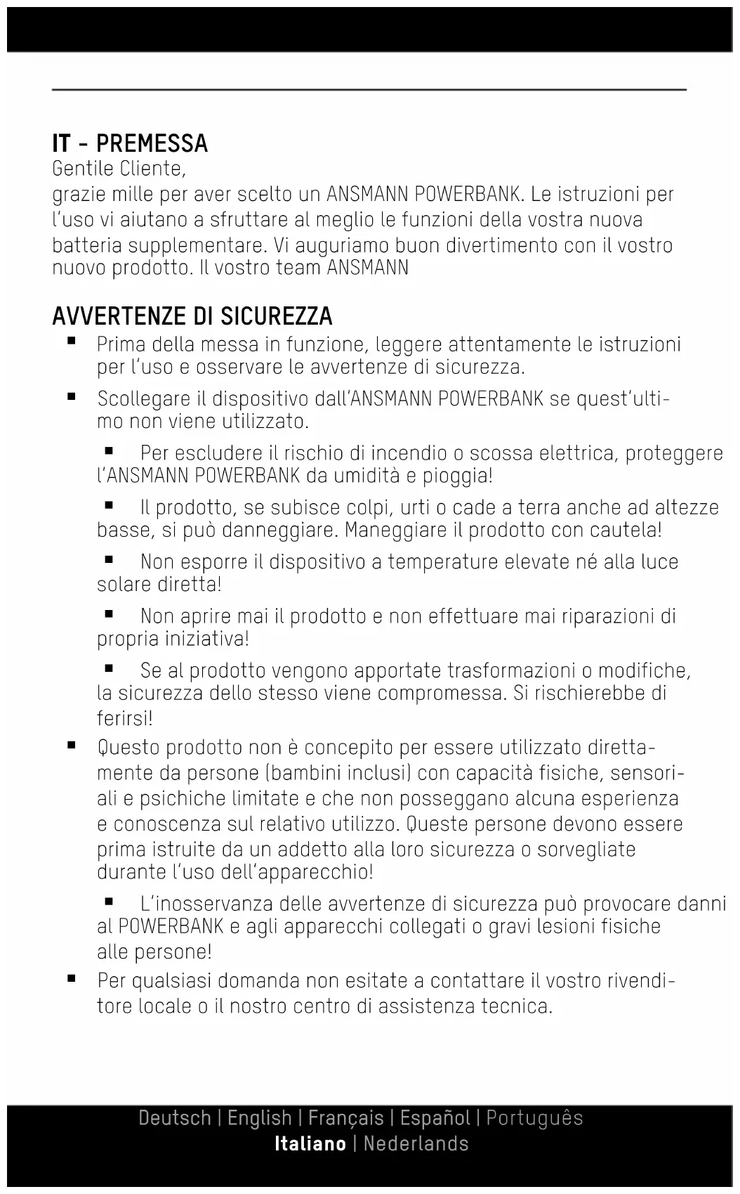 Prima della messa in funzione, leggere attentamente le istruzioni per l‘uso e osservare le avvertenze di sicurezza. Scollegare il dispositivo dall‘ANSMANN POWERBANK se quest‘ulti- mo non viene utilizzato. Per escludere il rischio di incendio o scossa elettrica, proteggere l‘ANSMANN POWERBANK da umidità e pioggia! Il prodotto, se subisce colpi, urti o cade a terra anche ad altezze basse, si può danneggiare. Maneggiare il prodotto con cautela! Non esporre il dispositivo a temperature elevate né alla luce solare diretta! Non aprire mai il prodotto e non effettuare mai riparazioni di propria iniziativa! Se al prodotto vengono apportate trasformazioni o modifiche, la sicurezza dello stesso viene compromessa. Si rischierebbe di ferirsi! Questo prodotto non è concepito per essere utilizzato diretta- mente da persone (bambini inclusi) con capacità fisiche, sensori- ali e psichiche limitate e che non posseggano alcuna esperienza e conoscenza sul relativo utilizzo. Queste persone devono essere prima istruite da un addetto alla loro sicurezza o sorvegliate durante l‘uso dell‘apparecchio! L‘inosservanza delle avvertenze di sicurezza può provocare danni al POWERBANK e agli apparecchi collegati o gravi lesioni fisiche alle persone! Per qualsiasi domanda non esitate a contattare il vostro rivendi- tore locale o il nostro centro di assistenza tecnica. Deutsch | English | Français | Español | Português Italiano | NederlandsMESSA IN FUNZIONE