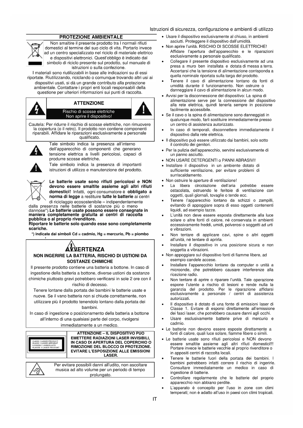 Usare il dispositivo esclusivamente al chiuso, in ambienti asciutti. Proteggere il dispositivo dall’umidità. Non aprire l’unità. RISCHIO DI SCOSSE ELETTRICHE! Affidare l’apertura dell’apparecchio e le riparazioni esclusivamente a personale qualificato. Collegare il presente dispositivo esclusivamente ad una presa a muro ben installata e dotata di messa a terra. Accertarsi che la tensione di alimentazione corrisponda a quella nominale riportata sulla targa del prodotto. Tenere il cavo di alimentazione lontano da fonti di umidità durante il funzionamento. Non ostruire o danneggiare il cavo di alimentazione in alcun modo. Avvisi per la disconnessione del dispositivo: La spina di alimentazione serve per la connessione del dispositivo alla rete elettrica, quindi tenerla sempre in posizione facilmente accessibile. Se il cavo o la spina di alimentazione sono danneggiati in qualunque modo, farli sostituire immediatamente presso un centro di assistenza autorizzato. In caso di temporali, disconnettere immediatamente il dispositivo dalla rete elettrica. Il dispositivo può essere utilizzato dai bambini, solo sotto il controllo dei genitori. Per la pulizia dell’apparecchio, servirsi esclusivamente di un panno asciutto. NON USARE DETERGENTI o PANNI ABRASIVI! Installare il dispositivo in un ambiente dotato di sufficiente ventilazione, per evitare problemi di surriscaldamento. Non ostruire le aperture di ventilazione! La libera circolazione dell’aria potrebbe essere ostacolata, ostruendo le feritoie di ventilazione con oggetti, quali giornali, tovaglie o tende ecc. Tenere l’apparecchio lontano da schizzi o zampilli, evitando di appoggiare sopra di esso oggetti contenenti liquidi, ad esempio tazze. L’unità non deve essere esposta direttamente alla luce solare o altre fonti di calore, né conservata in ambienti eccessivamente freddi, umidi, polverosi o soggetti ad urti e vibrazioni. Non tentare di applicare cavi, spine o altri oggetti all’unità, né tentare di aprirla. Installare il dispositivo in una posizione sicura e non soggetta a vibrazioni. Non appoggiare sul dispositivo fonti di fiamme libere, ad esempio candele accese. Installare l’apparecchio lontano da computer o unità a microonde, che potrebbero causare interferenze alla ricezione radio. Non tentare di aprire o riparare l’unità. Tale operazione espone l’utente a rischio di lesioni e rende nulla la garanzia del prodotto. Per le riparazione affidarsi esclusivamente a personale / centri di assistenza autorizzati. Il dispositivo è dotato di una fonte di emissioni laser di Classe 1. Evitare di esporsi direttamente all’emissione dei fasci laser, che potrebbero causare danni agli occhi. Usare esclusivamente batterie prive di mercurio e cadmio. Le batterie non devono essere esposte direttamente a fonti di calore, quali luce solare, fiamme libere o simili. Le batterie usate sono rifiuti pericolosi e NON devono essere smaltite assieme agli altri rifiuti domestici!!! Portare invece le batterie vecchie al proprio rivenditore o in appositi centri di raccolta locali. Tenere le batterie fuori della portata dei bambini. I bambini potrebbero infatti correre il rischio di ingerirle. Consultare immediatamente un medico in caso di ingestione di batterie. Controllare regolarmente che le batterie del proprio apparecchio non abbiano perdite. L’apparato è concepito per l’uso in zone con climi temperati; non è adatto all’uso in paesi con climi tropicali.PDB1910 / Manuale d’uso in italiano