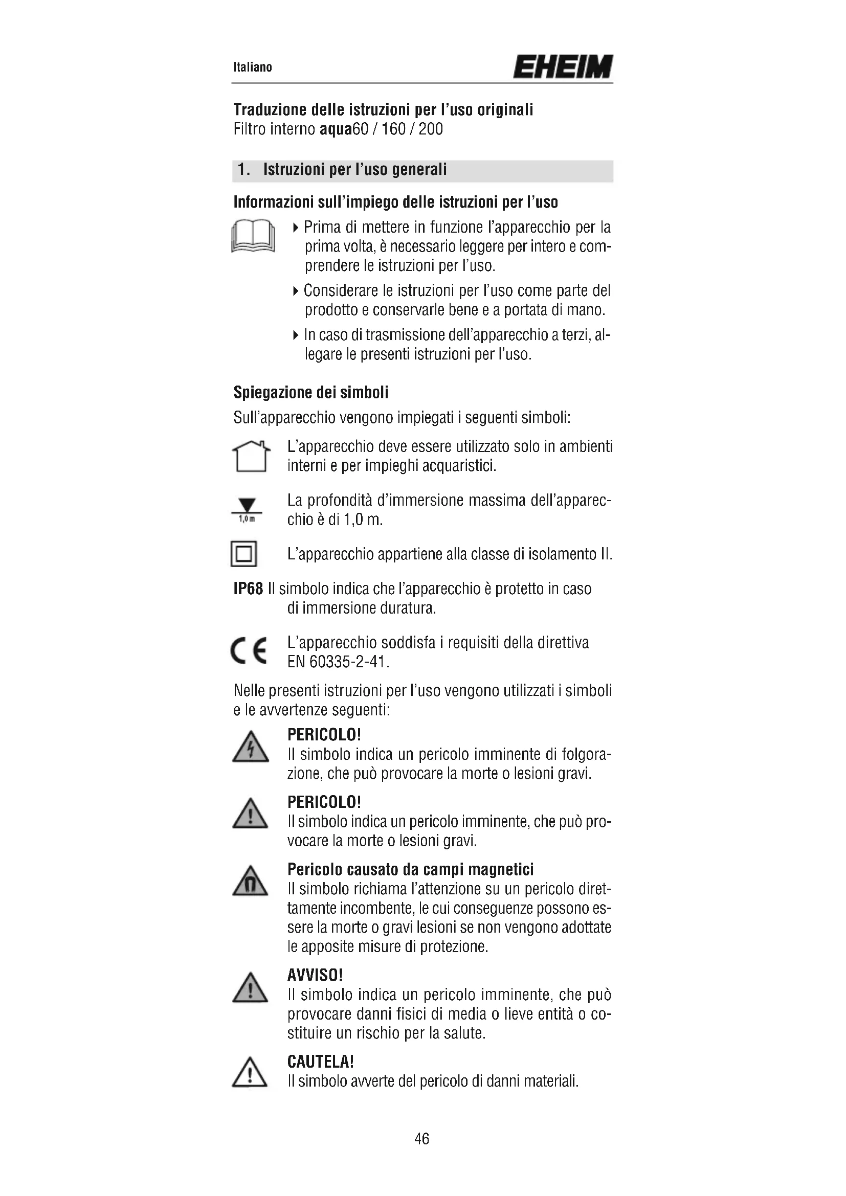 Informazioni sull’impiego delle istruzioni per l’uso 4Prima di mettere in funzione l’apparecchio per la prima volta, è necessario leggere per intero e com- prendere le istruzioni per l’uso. 4Considerare le istruzioni per l’uso come parte del prodotto e conservarle bene e a portata di mano. 4In caso di trasmissione dell’apparecchio a terzi, al- legare le presenti istruzioni per l’uso. Spiegazione dei simboli Sull’apparecchio vengono impiegati i seguenti simboli: L’apparecchio deve essere utilizzato solo in ambienti interni e per impieghi acquaristici. La profondità d’immersione massima dell’apparec- chio è di 1,0 m. L’apparecchio appartiene alla classe di isolamento II. IP68 Il simbolo indica che l’apparecchio è protetto in caso di immersione duratura. L’apparecchio soddisfa i requisiti della direttiva EN 60335-2-41. Nelle presenti istruzioni per l’uso vengono utilizzati i simboli e le avvertenze seguenti: PERICOLO! Il simbolo indica un pericolo imminente di folgora- zione, che può provocare la morte o lesioni gravi. PERICOLO! Il simbolo indica un pericolo imminente, che può pro- vocare la morte o lesioni gravi. Pericolo causato da campi magnetici Il simbolo richiama l’attenzione su un pericolo diret- tamente incombente, le cui conseguenze possono es- sere la morte o gravi lesioni se non vengono adottate le apposite misure di protezione. AVVISO! Il simbolo indica un pericolo imminente, che può provocare danni fisici di media o lieve entità o co- stituire un rischio per la salute. CAUTELA! Il simbolo avverte del pericolo di danni materiali. Traduzione delle istruzioni per l’uso originali Filtro interno aqua60 / 160 / 200 Italiano 46Italiano Avvertenza con informazioni e suggerimenti utili. Convenzioni di rappresentazione: A Rimando a una figura, qui rimando alla figura A. Viene richiesta un’azione da parte vostra.