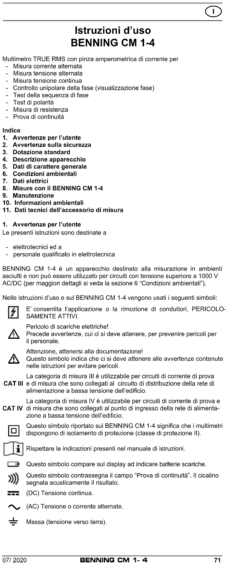 Multimetro TRUE RMS con pinza amperometrica di corrente per - Misura corrente alternata - Misura tensione alternata - Misura tensione continua - Controllo unipolare della fase (visualizzazione fase) - Test della sequenza di fase - Test di polarità - Misura di resistenza - Prova di continuitàIndice1. Avvertenze per l’utente2. Avvertenze sulla sicurezza3. Dotazione standard4. Descrizione apparecchio 5. Dati di carattere generale6. Condizioni ambientali 7. Dati elettrici8. Misure con il BENNING CM 1-4 9. Manutenzione10. Informazioni ambientali 11. Dati tecnici dell’accessorio di misura1. Avvertenze per l’utenteLe presenti istruzioni sono destinate a - elettrotecnici ed a - personale qualicato in elettrotecnica BENNING CM 1-4 è un apparecchio destinato alla misurazione in ambienti asciutti e non può essere utilizzato per circuiti con tensione superiore a 1000 V AC/DC (per maggiori dettagli si veda la sezione 6 “Condizioni ambientali”).Nelle istruzioni d’uso e sul BENNING CM 1-4 vengono usati i seguenti simboli:E’ consentita l’applicazione o la rimozione di conduttori, PERICOLO-SAMENTE ATTIVI. Pericolo di scariche elettriche! Precede avvertenze, cui ci si deve attenere, per prevenire pericoli per il personale. Attenzione, attenersi alla documentazione! Questo simbolo indica che ci si deve attenere alle avvertenze contenute nelle istruzioni per evitare pericoli.CAT IIILa categoria di misura III è utilizzabile per circuiti di corrente di prova e di misura che sono collegati al circuito di distribuzione della rete di alimentazione a bassa tensione dell’edicio.CAT IVLa categoria di misura IV è utilizzabile per circuiti di corrente di prova e di misura che sono collegati al punto di ingresso della rete di alimenta-zione a bassa tensione dell’edicio. Questo simbolo riportato sui BENNING CM 1-4 signica che i multimetri dispongono di isolamento di protezione (classe di protezione II).Rispettare le indicazioni presenti nel manuale di istruzioni.Questo simbolo compare sul display ad indicare batterie scariche.Questo simbolo contrassegna il campo “Prova di continuità”. Il cicalino segnala acusticamente il risultato.(DC) Tensione continua. (AC) Tensione o corrente alternate. Massa (tensione verso terra).72