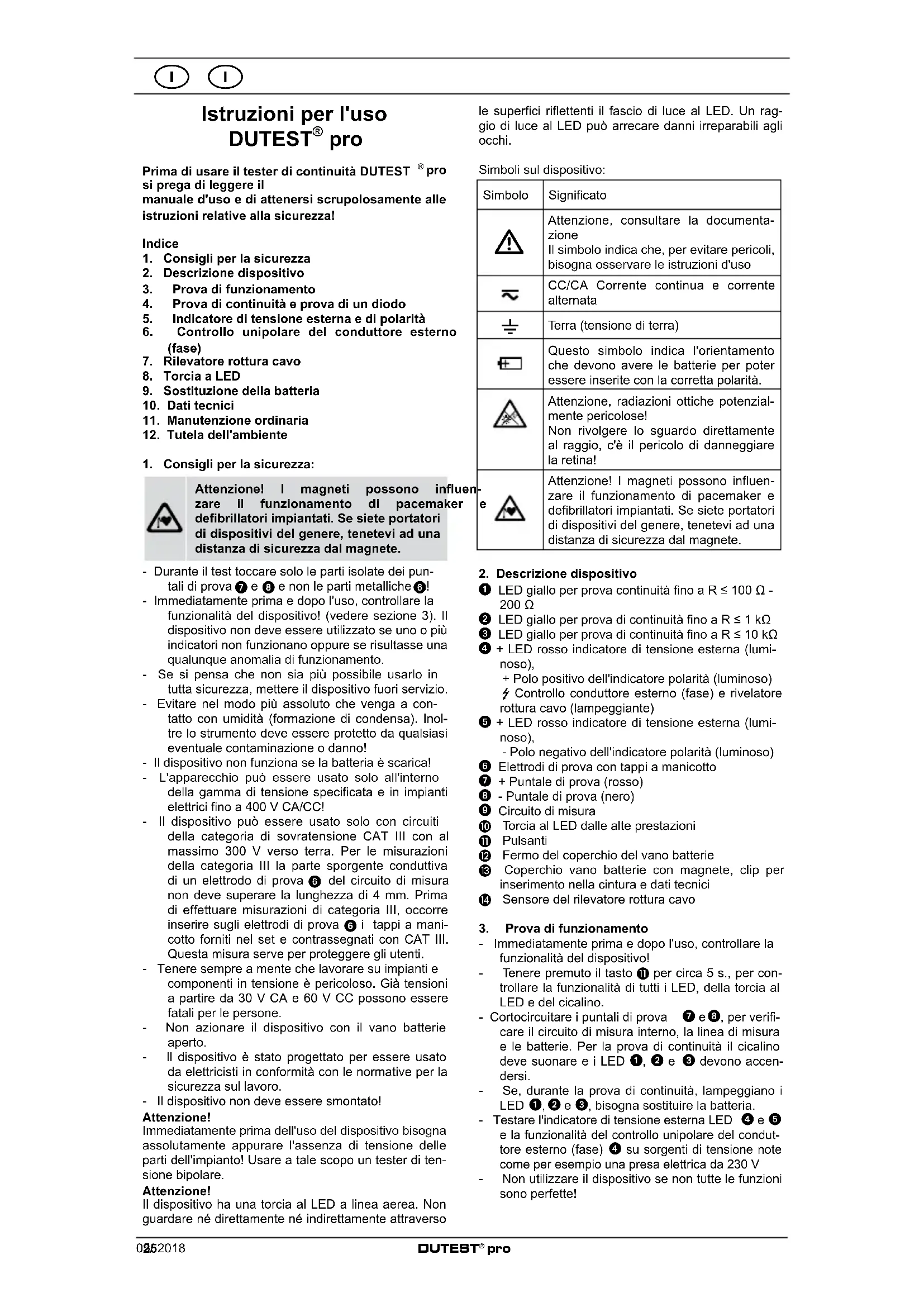 su sorgenti di tensione note come per esempio una presa elettrica da 230 V - Non utilizzare il dispositivo se non tutte le funzioni sono perfette!05/ 2018 DUTEST