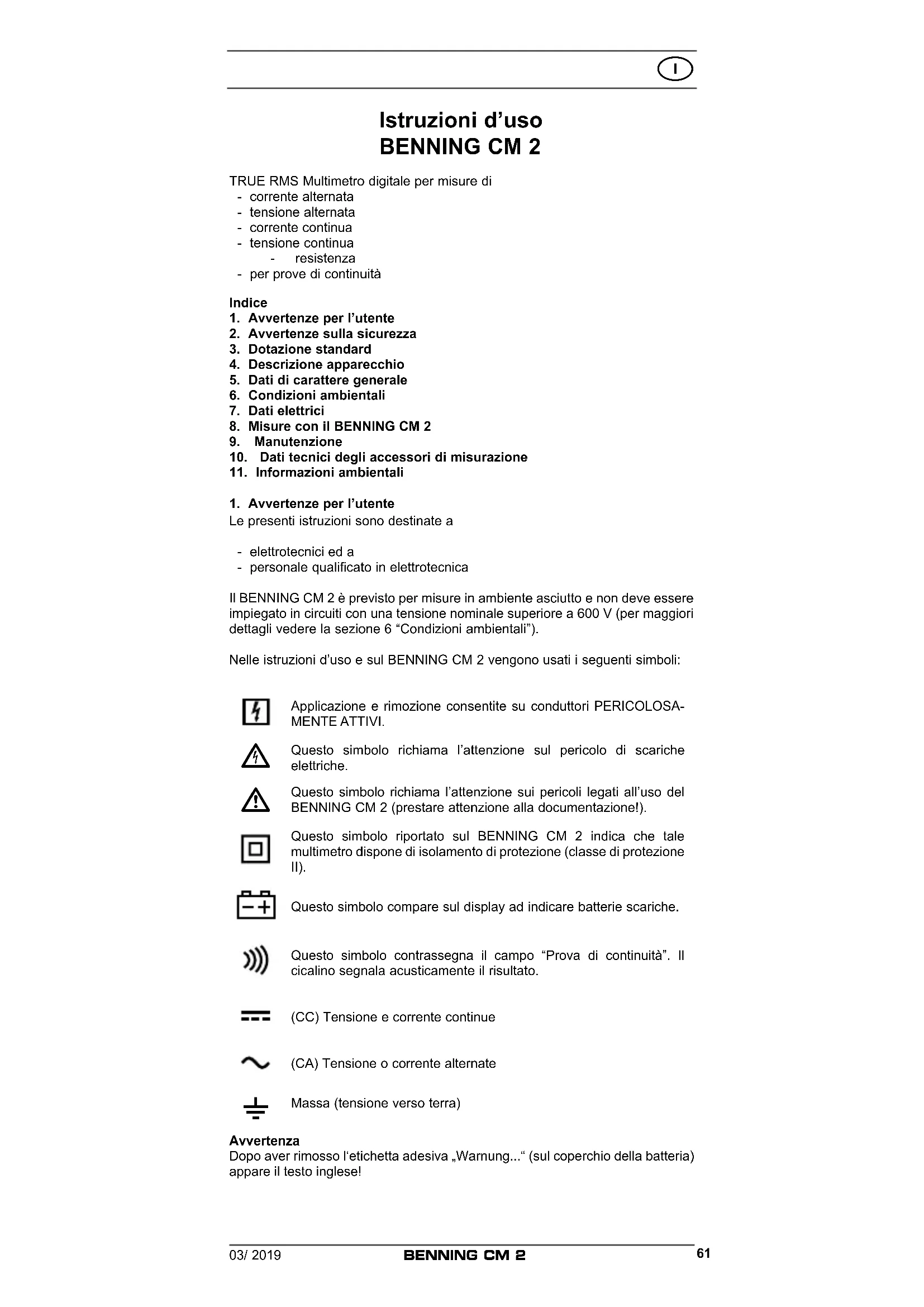 Massa (tensione verso terra) Avvertenza Dopo aver rimosso l‘etichetta adesiva „Warnung...“ (sul coperchio della batteria) appare il testo inglese!03/ 2019 BENNING CM 2