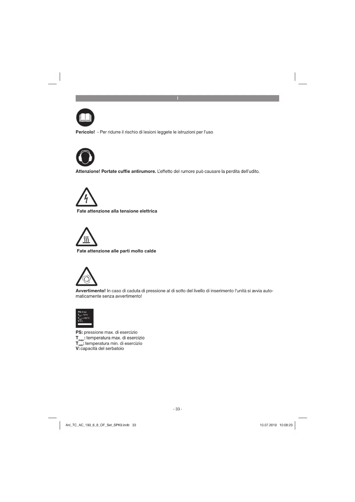 Attenzione! Portate cuffi e antirumore. L’e ff etto del rumore può causare la perdita dell’udito. Pericolo! - Per ridurre il rischio di lesioni leggete le istruzioni per l’uso Fate attenzione alla tensione elettrica Fate attenzione alle parti molto calde Avvertimento! In caso di caduta di pressione al di sotto del livello di inserimento l‘unità si avvia auto- maticamente senza avvertimento! PS: pressione max. di esercizio