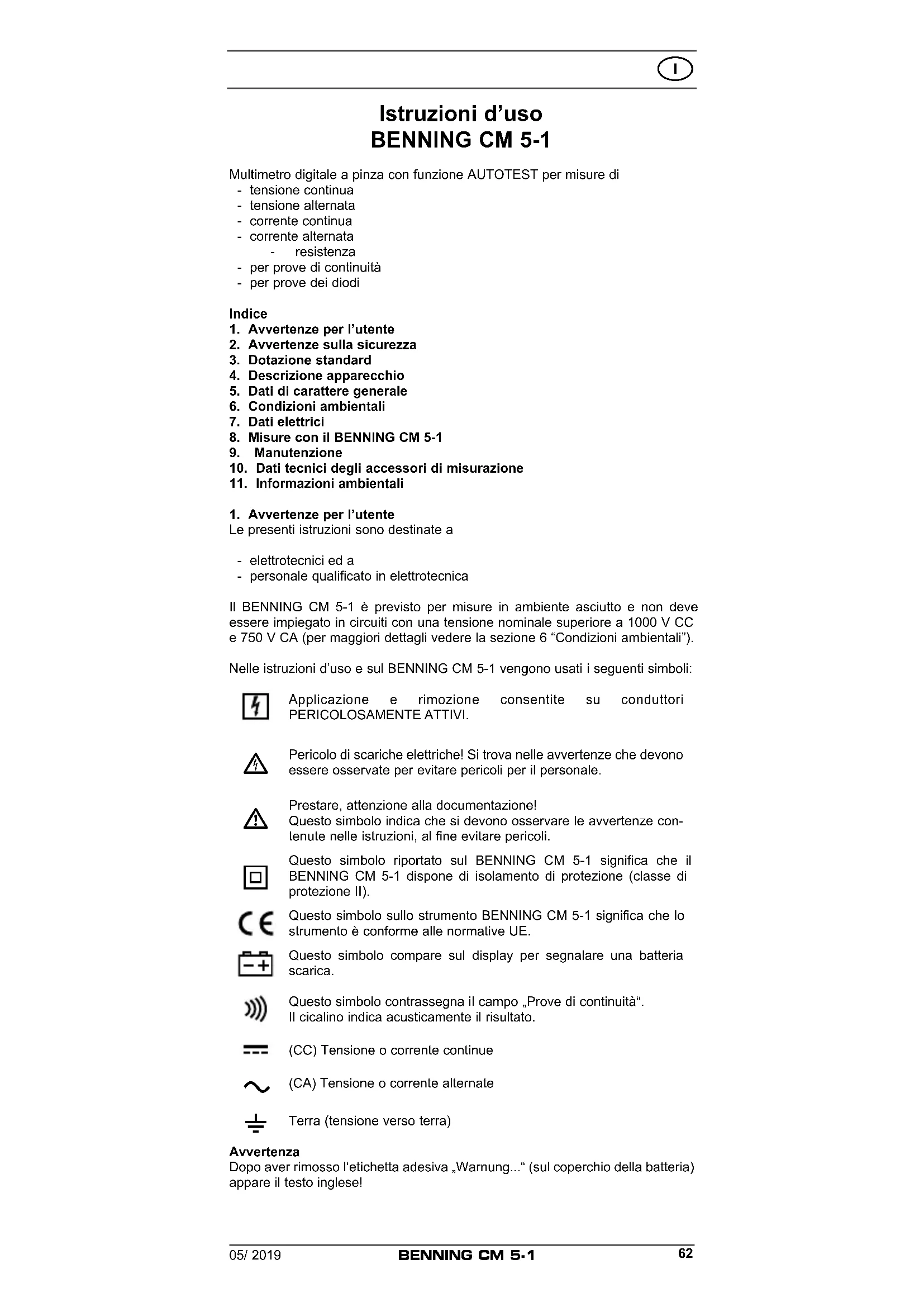Terra (tensione verso terra) Avvertenza Dopo aver rimosso l‘etichetta adesiva „Warnung...“ (sul coperchio della batteria) appare il testo inglese!BENNING CM 5-1 05/ 2019