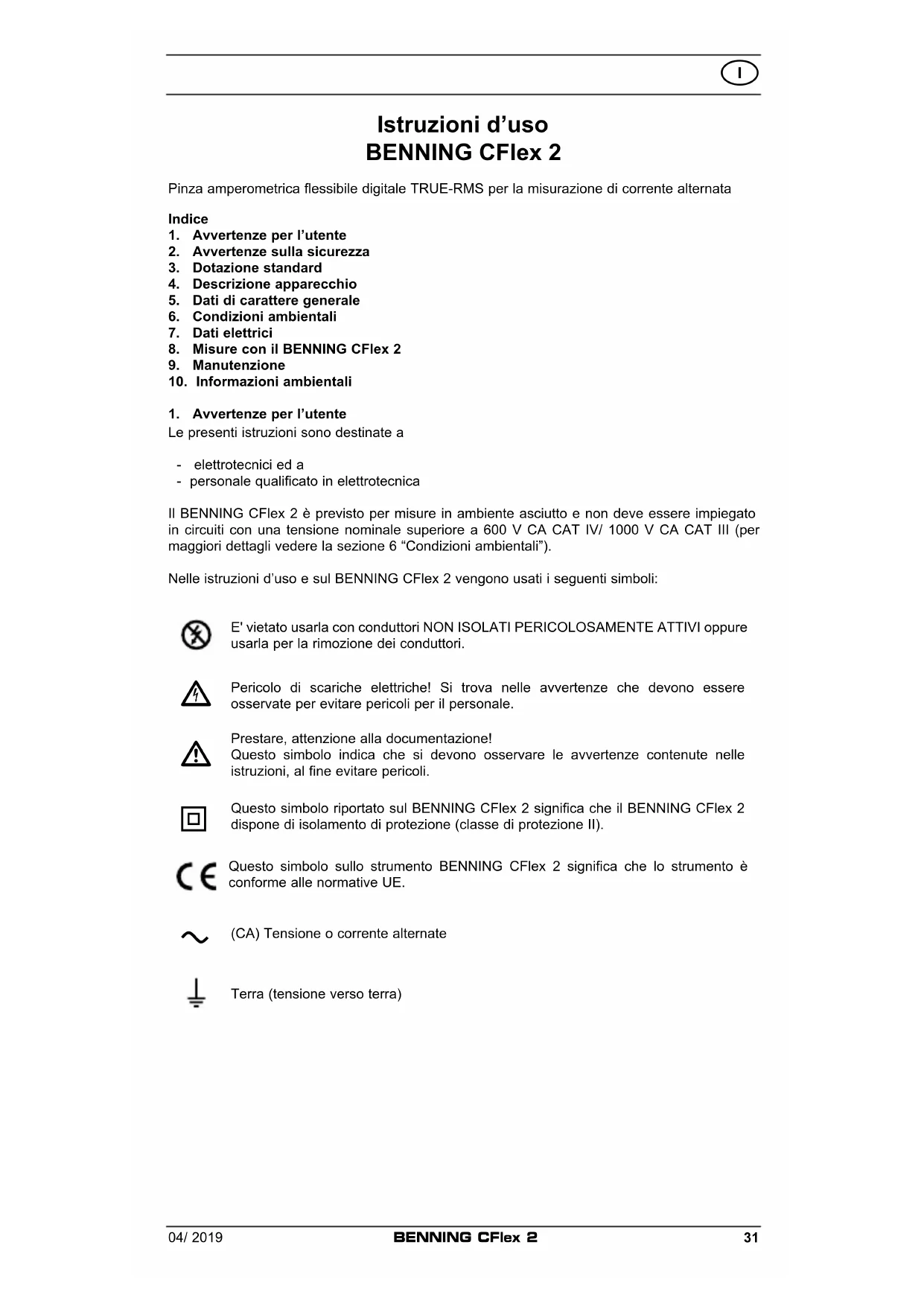 Istruzioni d’uso BENNING CFlex 2 Pinza amperometrica flessibile digitale TRUE-RMS per la misurazione di corrente alternataIndice1. Avvertenze per l’utente2. Avvertenze sulla sicurezza3. Dotazione standard4. Descrizione apparecchio5. Dati di carattere generale6. Condizioni ambientali7. Dati elettrici8. Misure con il BENNING CFlex 29. Manutenzione10. Informazioni ambientali1. Avvertenze per l’utenteLe presenti istruzioni sono destinate a - elettrotecnici ed a - personale qualificato in elettrotecnicaIl BENNING CFlex 2 è previsto per misure in ambiente asciutto e non deve essere impiegato in circuiti con una tensione nominale superiore a 600 V CA CAT IV/ 1000 V CA CAT III (per maggiori dettagli vedere la sezione 6 “Condizioni ambientali”).Nelle istruzioni d’uso e sul BENNING CFlex 2 vengono usati i seguenti simboli:E' vietato usarla con conduttori NON ISOLATI PERICOLOSAMENTE ATTIVI oppure usarla per la rimozione dei conduttori. Pericolo di scariche elettriche! Si trova nelle avvertenze che devono essere osservate per evitare pericoli per il personale. Prestare, attenzione alla documentazione!Questo simbolo indica che si devono osservare le avvertenze contenute nelle istruzioni, al fine evitare pericoli. Questo simbolo riportato sul BENNING CFlex 2 significa che il BENNING CFlex 2 dispone di isolamento di protezione (classe di protezione II).Questo simbolo sullo strumento BENNING CFlex 2 significa che lo strumento è conforme alle normative UE. (CA) Tensione o corrente alternateTerra (tensione verso terra)04/ 2019 BENNING CFlex 2