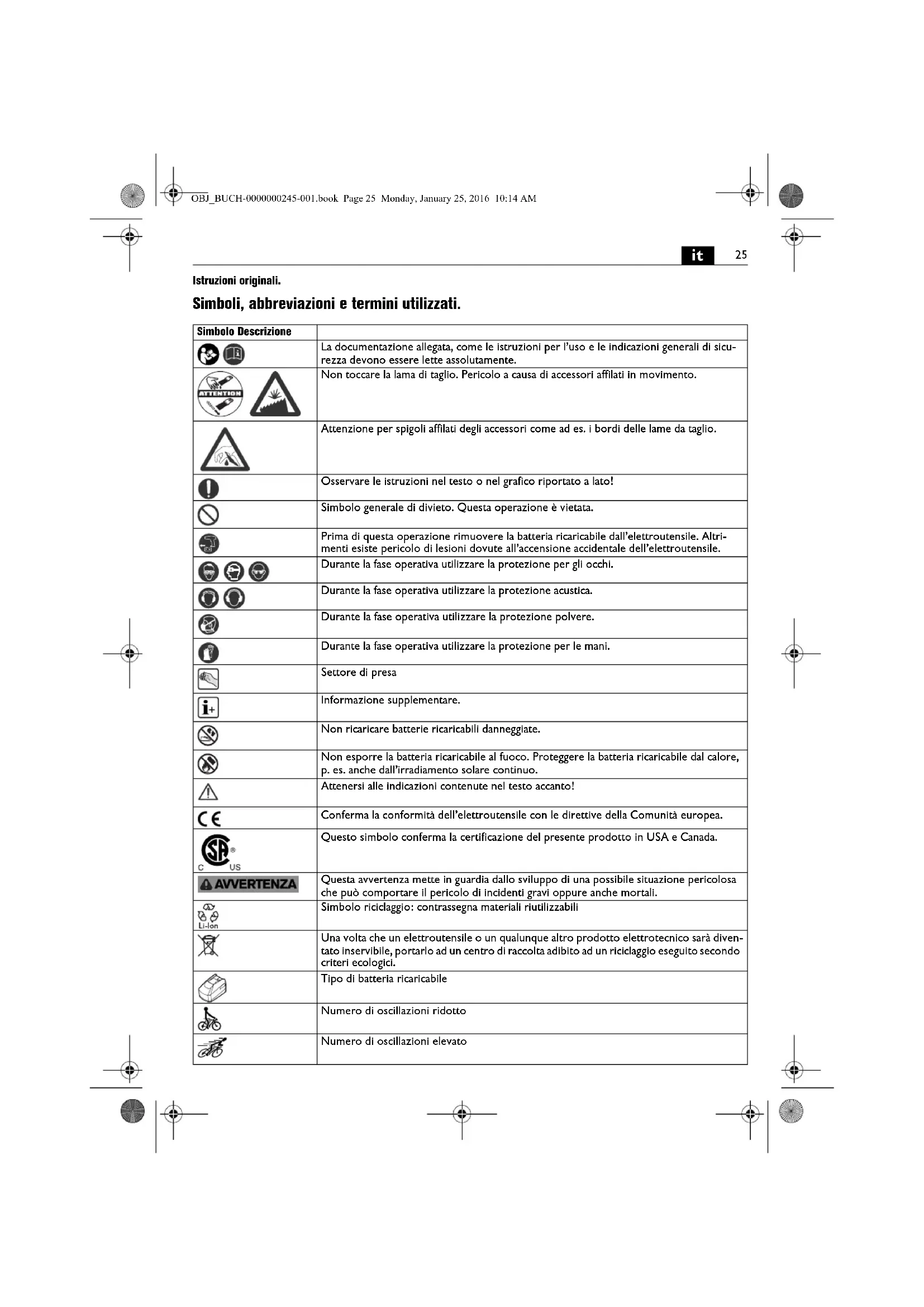 Istruzioni originali. Simboli, abbreviazioni e termini utilizzati. Simbolo Descrizione La documentazione allegata, come le istruzioni per l’uso e le indicazioni generali di sicu- rezza devono essere lette assolutamente. Non toccare la lama di taglio. Pericolo a causa di accessori affilati in movimento. Attenzione per spigoli affilati degli accessori come ad es. i bordi delle lame da taglio. Osservare le istruzioni nel testo o nel grafico riportato a lato! Simbolo generale di divieto. Questa operazione è vietata. Prima di questa operazione rimuovere la batteria ricaricabile dall’elettroutensile. Altri- menti esiste pericolo di lesioni dovute all’accensione accidentale dell’elettroutensile. Durante la fase operativa utilizzare la protezione per gli occhi. Durante la fase operativa utilizzare la protezione acustica. Durante la fase operativa utilizzare la protezione polvere. Durante la fase operativa utilizzare la protezione per le mani. Settore di presa Informazione supplementare. Non ricaricare batterie ricaricabili danneggiate. Non esporre la batteria ricaricabile al fuoco. Proteggere la batteria ricaricabile dal calore, p. es. anche dall’irradiamento solare continuo. Attenersi alle indicazioni contenute nel testo accanto! Conferma la conformità dell’elettroutensile con le direttive della Comunità europea. Questo simbolo conferma la certificazione del presente prodotto in USA e Canada. Questa avvertenza mette in guardia dallo sviluppo di una possibile situazione pericolosa che può comportare il pericolo di incidenti gravi oppure anche mortali. Simbolo riciclaggio: contrassegna materiali riutilizzabili Una volta che un elettroutensile o un qualunque altro prodotto elettrotecnico sarà diven- tato inservibile, portarlo ad un centro di raccolta adibito ad un riciclaggio eseguito secondo criteri ecologici. Tipo di batteria ricaricabile Numero di oscillazioni ridotto Numero di oscillazioni elevato OBJ_BUCH-0000000245-001.book Page 25 Monday, January 25, 2016 10:14 AM26