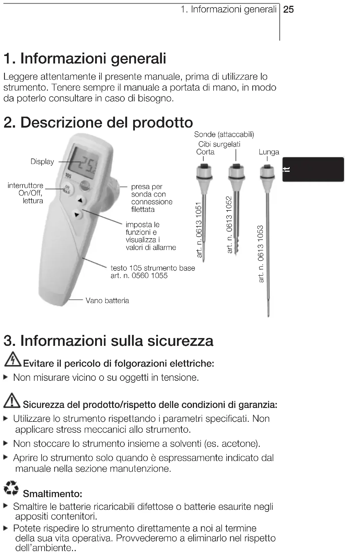 Evitare il pericolo di folgorazioni elettriche: Non misurare vicino o su oggetti in tensione. Sicurezza del prodotto/rispetto delle condizioni di garanzia: Utilizzare lo strumento rispettando i parametri specificati. Non applicare stress meccanici allo strumento. Non stoccare lo strumento insieme a solventi (es. acetone). Aprire lo strumento solo quando è espressamente indicato dal manuale nella sezione manutenzione. Smaltimento: Smaltire le batterie ricaricabili difettose o batterie esaurite negli appositi contenitori. Potete rispedire lo strumento direttamente a noi al termine della sua vita operativa. Provvederemo a eliminarlo nel rispetto dell’ambiente..