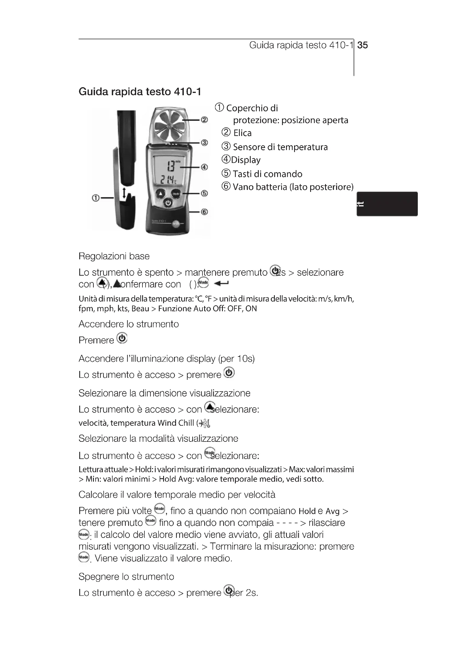 ??Notes34Guida rapida testo 410-1 35 Guida rapida testo 410-1 À Coperchio di protezione: posizione aperta Á Elica  Sensore di temperatura à Display Ä Tasti di comando Å Vano batteria (lato posteriore) Regolazioni base Lo strumento è spento > mantenere premuto 2s > selezionare con ( ), confermare con ( ): Unità di misura della temperatura: °C, °F > unità di misura della velocità: m/s, km/h, fpm, mph, kts, Beau > Funzione Auto Off: OFF, ON Accendere lo strumento Premere . Accendere l’illuminazione display (per 10s) Lo strumento è acceso > premere . Selezionare la dimensione visualizzazione Lo strumento è acceso > con selezionare: velocità, temperatura Wind Chill ( ) Selezionare la modalità visualizzazione Lo strumento è acceso > con selezionare: Lettura attuale > Hold: i valori misurati rimangono visualizzati > Max: valori massimi > Min: valori minimi > Hold Avg: valore temporale medio, vedi sotto. Calcolare il valore temporale medio per velocità Premere più volte , fino a quando non compaiano Hold e Avg > tenere premuto fino a quando non compaia - - - - > rilasciare