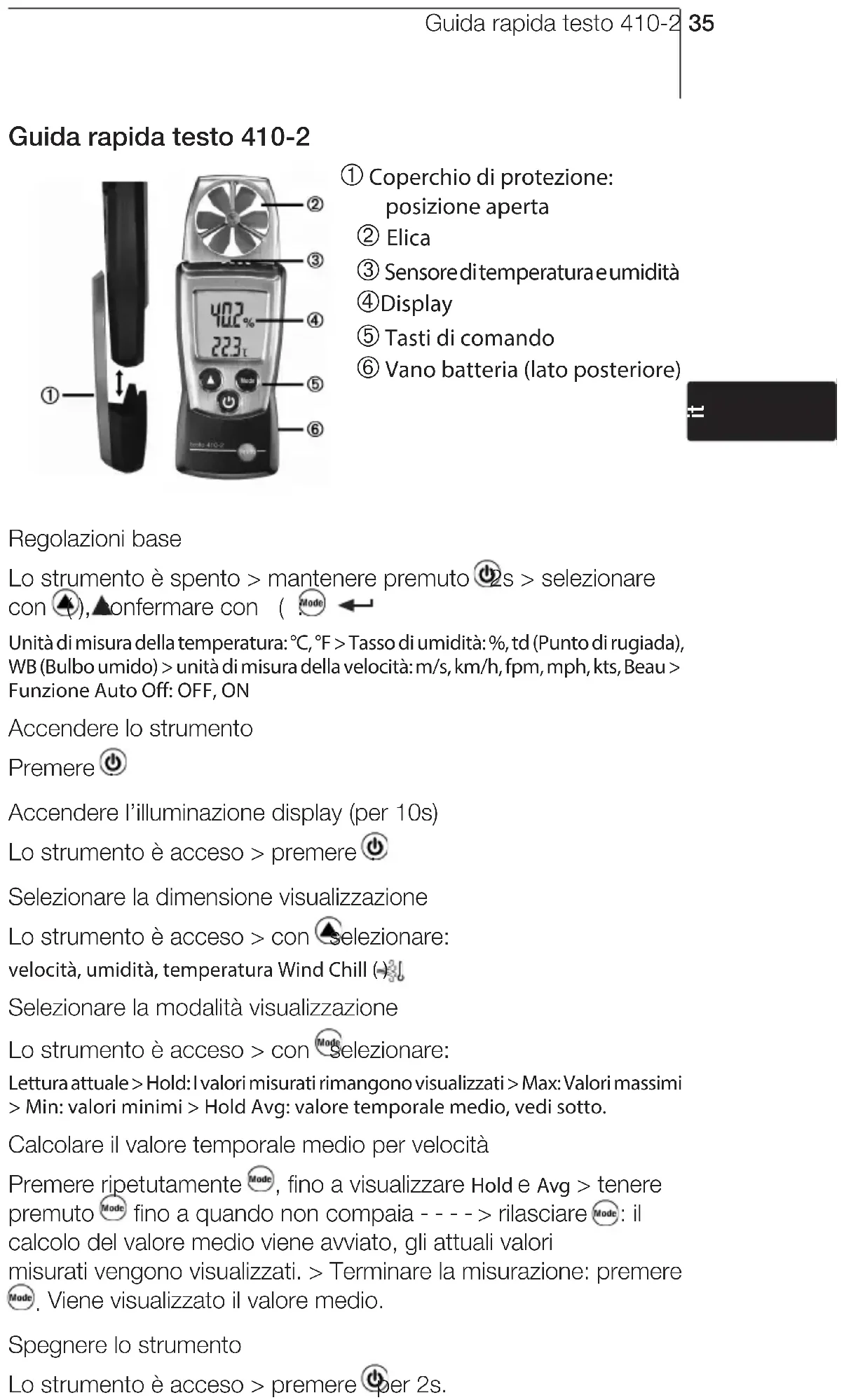 ??Notes34Guida rapida testo 410-2 35 Guida rapida testo 410-2 À Coperchio di protezione: posizione aperta Á Elica  Sensore di temperatura e umidità à Display Ä Tasti di comando Å Vano batteria (lato posteriore) Regolazioni base Lo strumento è spento > mantenere premuto 2s > selezionare con ( ), confermare con ( : Unità di misura della temperatura: °C, °F > Tasso di umidità: %, td (Punto di rugiada), WB (Bulbo umido) > unità di misura della velocità: m/s, km/h, fpm, mph, kts, Beau > Funzione Auto Off: OFF, ON Accendere lo strumento Premere . Accendere l’illuminazione display (per 10s) Lo strumento è acceso > premere . Selezionare la dimensione visualizzazione Lo strumento è acceso > con selezionare: velocità, umidità, temperatura Wind Chill ( ) Selezionare la modalità visualizzazione Lo strumento è acceso > con selezionare: Lettura attuale > Hold: I valori misurati rimangono visualizzati > Max: Valori massimi > Min: valori minimi > Hold Avg: valore temporale medio, vedi sotto. Calcolare il valore temporale medio per velocità Premere ripetutamente , fino a visualizzare Hold e Avg > tenere premuto fino a quando non compaia - - - - > rilasciare : il calcolo del valore medio viene avviato, gli attuali valori misurati vengono visualizzati. > Terminare la misurazione: premere