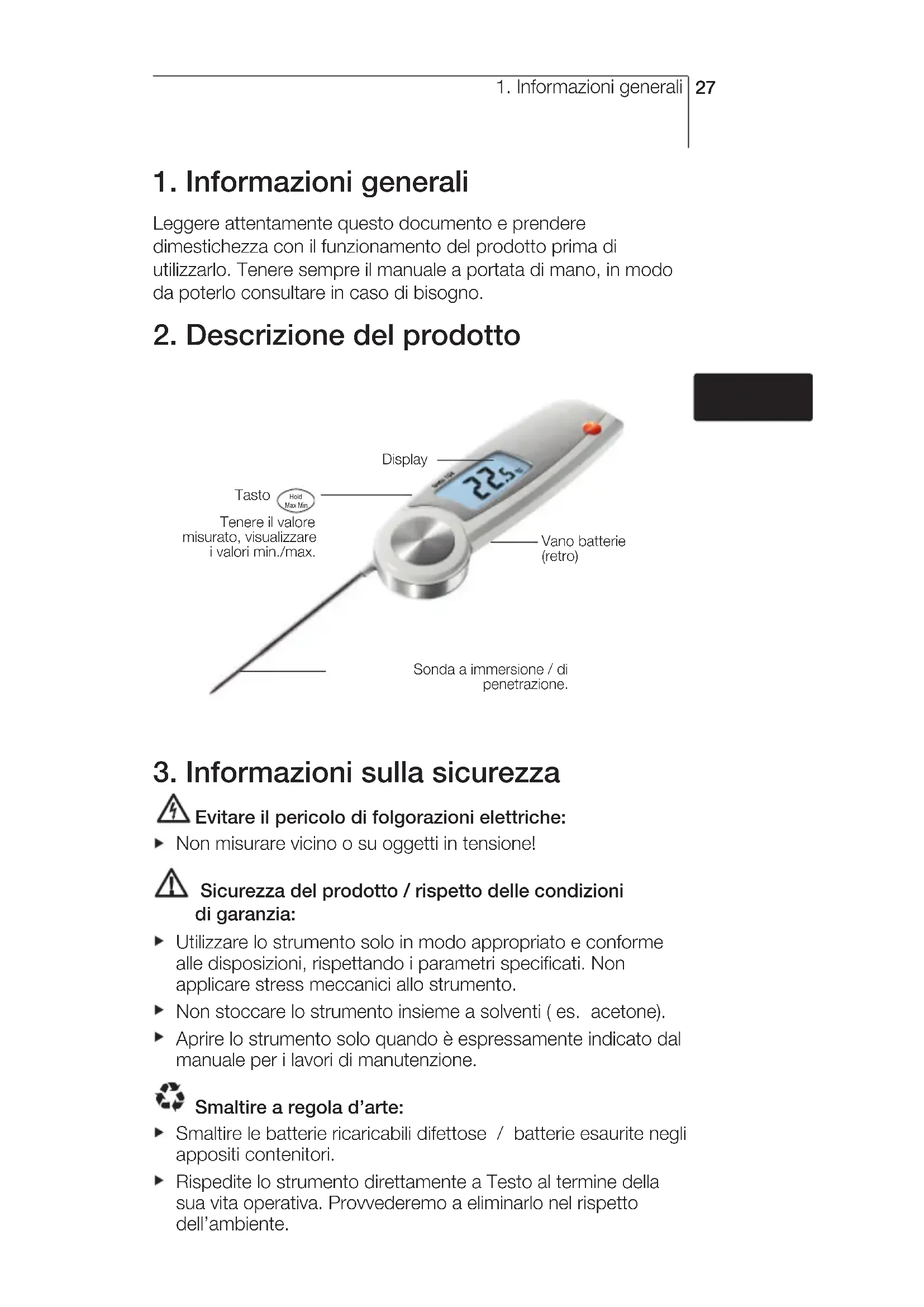 Evitare il pericolo di folgorazioni elettriche: Non misurare vicino o su oggetti in tensione! Sicurezza del prodotto / rispetto delle condizioni di garanzia: Utilizzare lo strumento solo in modo appropriato e conforme alle disposizioni, rispettando i parametri specificati. Non applicare stress meccanici allo strumento. Non stoccare lo strumento insieme a solventi ( es. acetone). Aprire lo strumento solo quando è espressamente indicato dal manuale per i lavori di manutenzione. Smaltire a regola d’arte: Smaltire le batterie ricaricabili difettose / batterie esaurite negli appositi contenitori. Rispedite lo strumento direttamente a Testo al termine della sua vita operativa. Provvederemo a eliminarlo nel rispetto dell’ambiente. enfresitptsvnl???? Tasto Tenere il valore misurato, visualizzare i valori min./max. Vano batterie (retro) Display Sonda a immersione / di penetrazione.