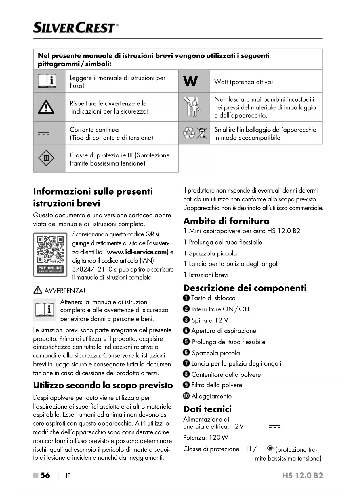 IT Informazioni sulle presenti istruzioni brevi Questo documento è una versione cartacea abbre- viata del manuale di istruzioni completo. Scansionando questo codice QR si giunge direttamente al sito dell’assisten- za clienti Lidl (www.lidl-service.com) e digitando il codice articolo (IAN) 378247_2110 si può aprire e scaricare il manuale di istruzioni completo. AVVERTENZA! Attenersi al manuale di istruzioni completo e alle avvertenze di sicurezza per evitare danni a persone e beni. Le istruzioni brevi sono parte integrante del presente prodotto. Prima di utilizzare il prodotto, acquisire dimestichezza con tutte le indicazioni relative ai comandi e alla sicurezza. Conservare le istruzioni brevi in luogo sicuro e consegnare tutta la documen- tazione in caso di cessione del prodotto a terzi. Utilizzo secondo lo scopo previsto L’aspirapolvere per auto viene utilizzato per l’aspirazione di superfici asciutte e di altro materiale aspirabile. Esseri umani ed animali non devono es- sere aspirati con questo apparecchio. Altri utilizzi o modifiche dell’apparecchio sono considerate come non conformi allíuso previsto e possono determinare rischi, quali ad esempio il pericolo di morte a segui- to di lesione o incidente nonché danneggiamenti. Il produttore non risponde di eventuali danni determi- nati da un utilizzo non conforme allo scopo previsto. Líapparecchio non è destinato allíutilizzo commerciale. Ambito di fornitura 1 Mini aspirapolvere per auto HS 12.0 B2 1 Prolunga del tubo flessibile 1 Spazzola piccola 1 Lancia per la pulizia degli angoli 1 Istruzioni brevi Descrizione dei componenti Tasto di sblocco Interruttore ON / OFF Spina a 12 V Apertura di aspirazione Prolunga del tubo flessibile Spazzola piccola Lancia per la pulizia degli angoli Contenitore della polvere Filtro della polvere Alloggiamento Dati tecnici Alimentazione di energia elettrica: 12 V Potenza: 120 W Classe di protezione: III / (protezione tra- mite bassissima tensione) Nel presente manuale di istruzioni brevi vengono utilizzati i seguenti pittogrammi / simboli: Leggere il manuale di istruzioni per l’uso!