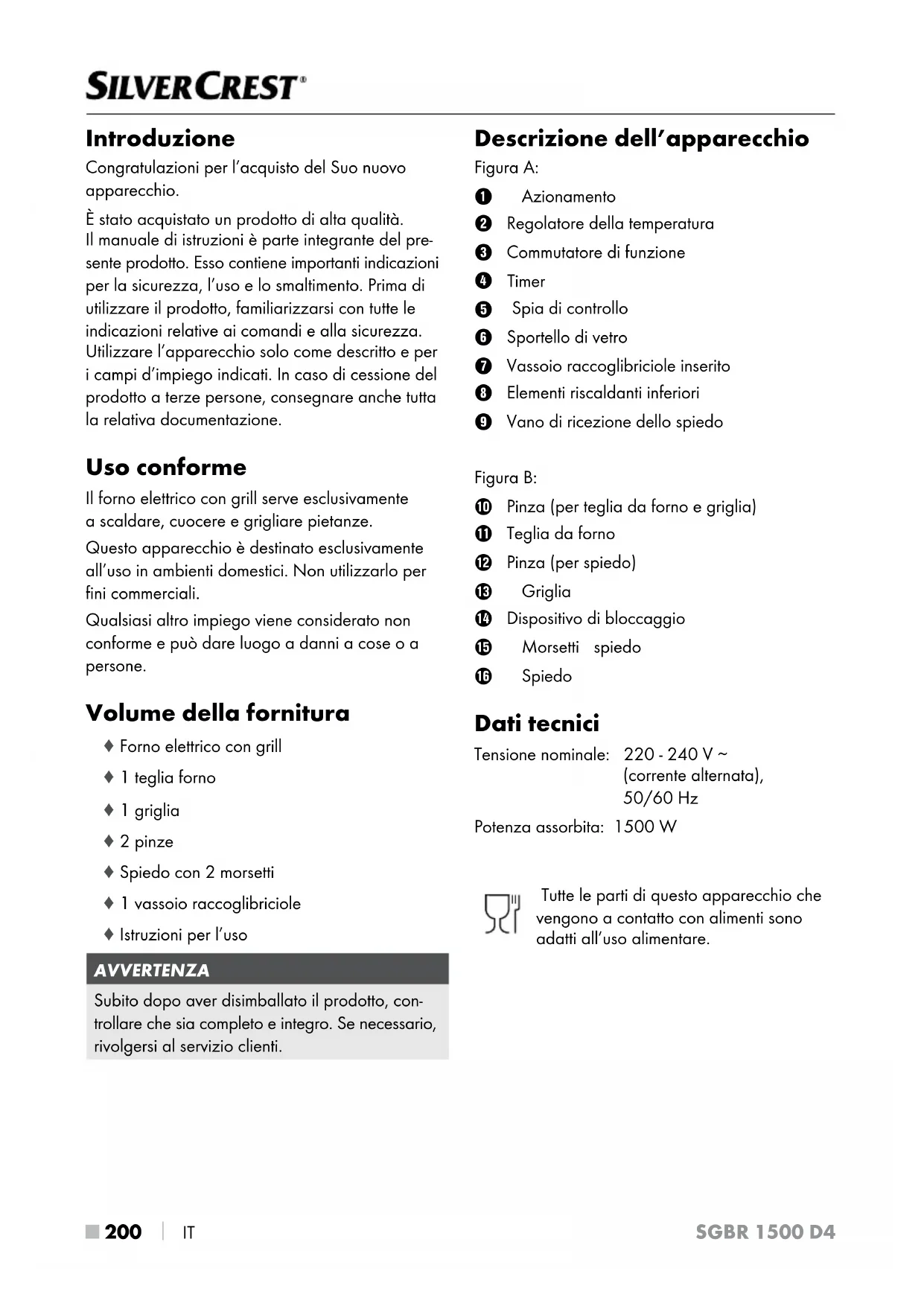 Spia di controllo 6 Sportello di vetro 7 Vassoio raccoglibriciole inserito 8 Elementi riscaldanti inferiori 9 Vano di ricezione dello spiedo Figura B: 0 Pinza (per teglia da forno e griglia) q Teglia da forno w Pinza (per spiedo) e Griglia r Dispositivo di bloccaggio t Morsetti spiedo z Spiedo Dati tecnici Tensione nominale: 220 - 240 V ∼ (corrente alternata), 50/60 Hz Potenza assorbita: 1500 W Tutte le parti di questo apparecchio che vengono a contatto con alimenti sono adatti all’uso alimentare.SGBR 1500 D4 IT