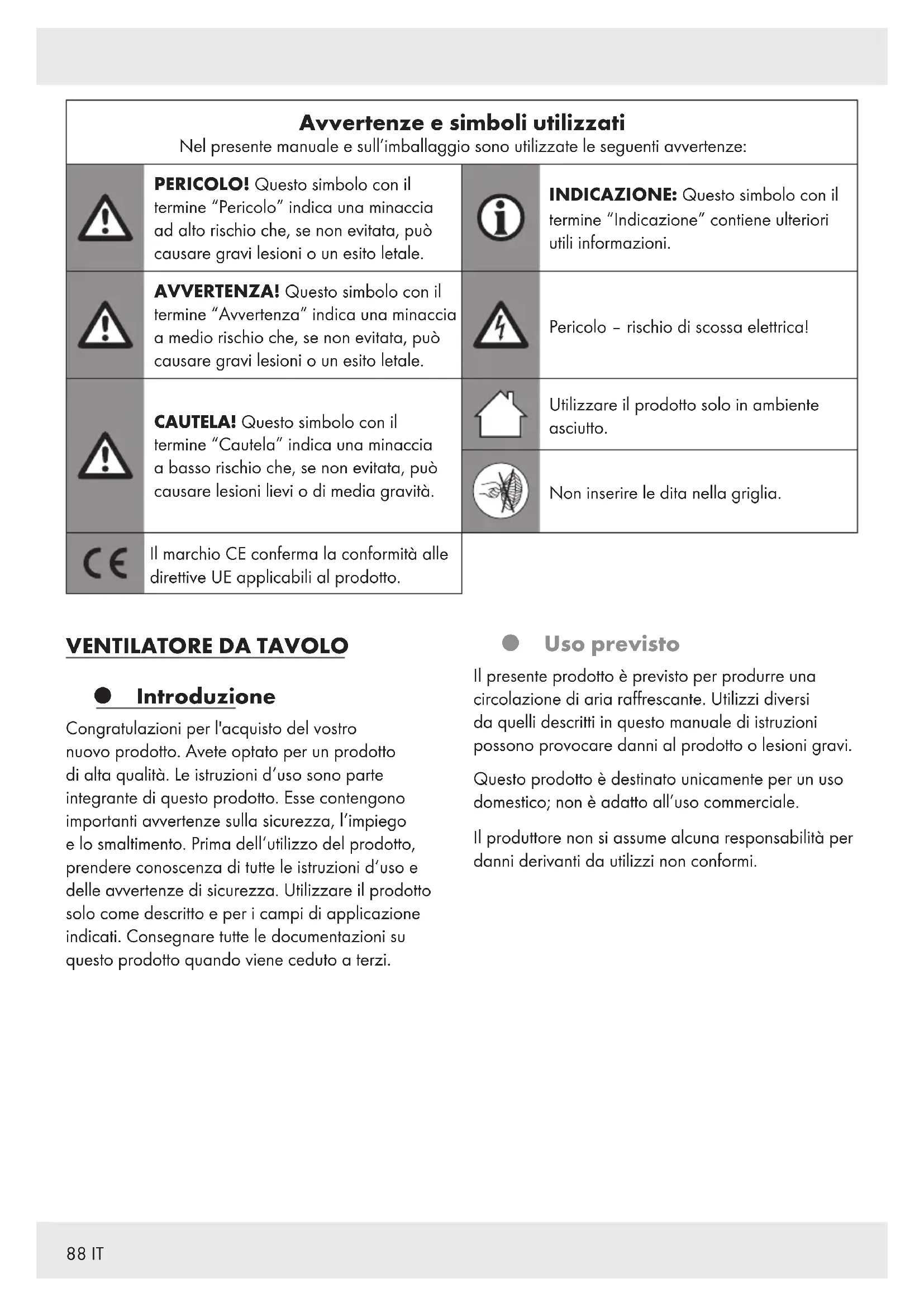 DOCUMENTAZIONE! In caso di danni dovuti al mancato rispetto di questo manuale di istruzioni, la garanzia è invalidata! La Società declina qualsiasi responsabilità per danni consequenziali! Il Produttore declina qualsiasi responsabilità in caso di danni a cose o persone dovuti a un utilizzo non conforme o al mancato rispetto delle istruzioni di sicurezza! Bambini e disabili mPERICOLO! Rischio di soffocamento! Non lasciare mai i bambini da soli in presenza di materiale di imballaggio. Il materiale di imballaggio comporta un pericolo di soffocamento. I bambini sottovalutano spesso i pericoli esistenti. Tenere sempre i materiali di imballaggio fuori dalla portata dei bambini. Questo prodotto può essere utilizzato da bambini a partire dagli 8anni e da persone con ridotte capacità fisiche, sensoriali o mentali o con mancanza di esperienza e di conoscenza, purché siano sorvegliati o istruiti all’uso del prodotto in sicurezza e ne comprendano i pericoli connessi. La pulizia e la manutenzione utente non possono essere eseguite da bambini senza supervisione. I bambini non devono giocare con il prodotto.91 IT Sicurezza elettrica mAVVERTENZA! Rischio di lesioni! Spegnere il prodotto e scollegarlo dall’alimentazione prima di pulirlo e quando non viene utilizzato. mAVVERTENZA! Rischio di scossa elettrica! Assicurarsi che la tensione nominale indicata sulla targhetta identificativa corrisponda alla tensione nominale dell’alimentazione elettrica. mAVVERTENZA! Rischio di scossa elettrica! Se il cavo di alimentazione elettrica del prodotto viene danneggiato deve essere sostituito dal produttore, dal suo servizio clienti o da un tecnico qualificato, per evitare rischi. Funzionamento Utilizzare il prodotto solo in ambiente asciutto. Proteggere il prodotto, il cavo di alimentazione e la spina dalla polvere, dai raggi diretti del sole, da gocce e spruzzi d’acqua. mCAUTELA! Rischio di lesioni! Scollegare il prodotto dall'alimentazione prima di rimuovere la griglia di protezione. mCAUTELA! Rischio di lesioni! Non utilizzare mai il prodotto senza griglia di protezione o con griglia di protezione danneggiata. mCAUTELA! Rischio di lesioni! Durante il funzionamento tenere le mani, i capelli, i capi di abbigliamento e altri oggetti lontano dalla griglia di sicurezza per evitare lesioni e danni al prodotto.92 IT Prima dell'uso Disimballaggio Rimuovere il materiale di imballaggio. Verificare se il prodotto è danneggiato. Montaggio Accessori richiesti: Cacciavite a croce Numero di persone richieste per il montaggio: 1adulto Fig. Fase