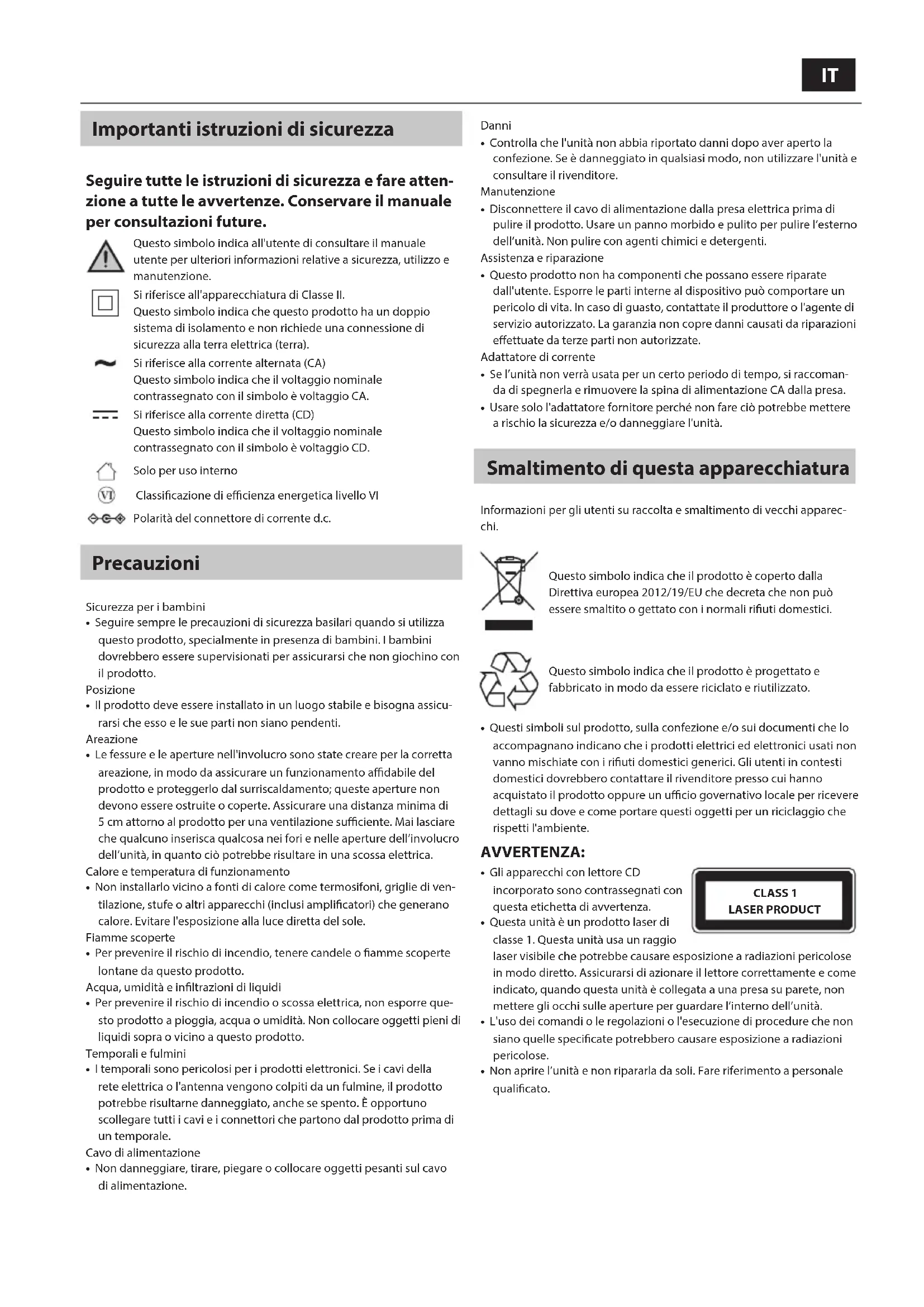 - Questa unità è un prodotto laser di classe 1. Questa unità usa un raggio laser visibile che potrebbe causare esposizione a radiazioni pericolose in modo diretto. Assicurarsi di azionare il lettore correttamente e come indicato, quando questa unità è collegata a una presa su parete, non mettere gli occhi sulle aperture per guardare l’interno dell’unità.