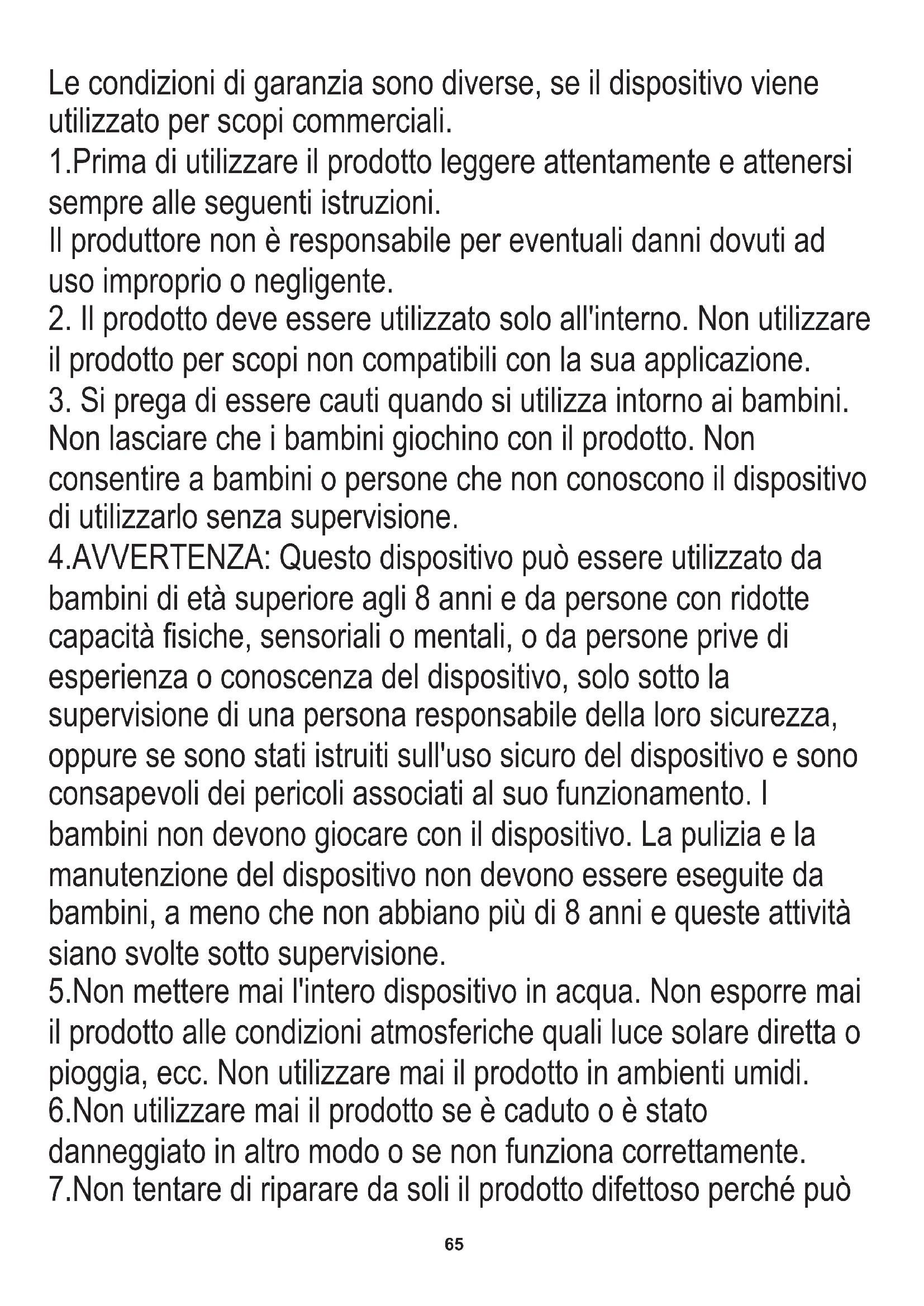 Non lasciare che i bambini giochino con il prodotto. Non consentire a bambini o persone che non conoscono il dispositivo di utilizzarlo senza supervisione. 6.Non utilizzare mai il prodotto se è caduto o è stato danneggiato in altro modo o se non funziona correttamente. 1.Prima di utilizzare il prodotto leggere attentamente e attenersi sempre alle seguenti istruzioni. 4.AVVERTENZA: Questo dispositivo può essere utilizzato da bambini di età superiore agli 8 anni e da persone con ridotte capacità fisiche, sensoriali o mentali, o da persone prive di esperienza o conoscenza del dispositivo, solo sotto la supervisione di una persona responsabile della loro sicurezza, oppure se sono stati istruiti sull'uso sicuro del dispositivo e sono consapevoli dei pericoli associati al suo funzionamento. I bambini non devono giocare con il dispositivo. La pulizia e la manutenzione del dispositivo non devono essere eseguite da bambini, a meno che non abbiano più di 8 anni e queste attività siano svolte sotto supervisione. 5.Non mettere mai l'intero dispositivo in acqua. Non esporre mai il prodotto alle condizioni atmosferiche quali luce solare diretta o pioggia, ecc. Non utilizzare mai il prodotto in ambienti umidi.