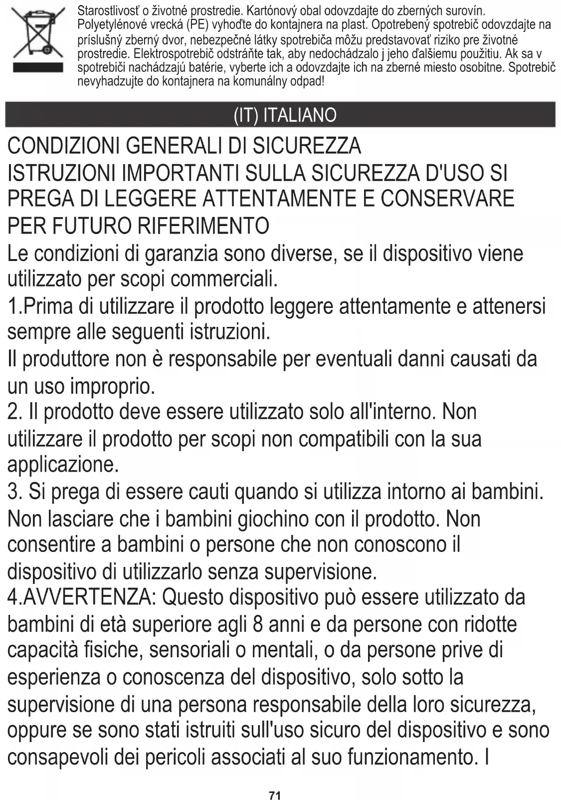 d'acqua. DATI TECNICI: Batteria: 2xAAA (1,5V) Gli imballi di cartone devono essere smaltiti nel contenitore per la carta. I sacchetti di polietilene (PE) vanno gettati nel contenitore per la plastica. L'apparecchio usato deve essere rottamato presso un centro di raccolta autorizzato, poiché contiene elementi pericolosi che potrebbero costituire una minaccia per l'ambiente. I dispositivi elettrici devono essere resi al fine di evitare il loro riutilizzo. Se il dispositivo contiene una batteria, deve essere rimossa e smaltita separatamente in un punto di raccolta. Prendersi cura dell'ambiente Non gettare l'apparecchio nei contenitori dei rifiuti urbani! (SR) СРПСКИ ОПШТИ УСЛОВИ БЕЗБЕДНОСТИ Услови гаранције су другачији, ако се уређај користи у комерцијалне сврхе. ЗА У БУДУЋЕ