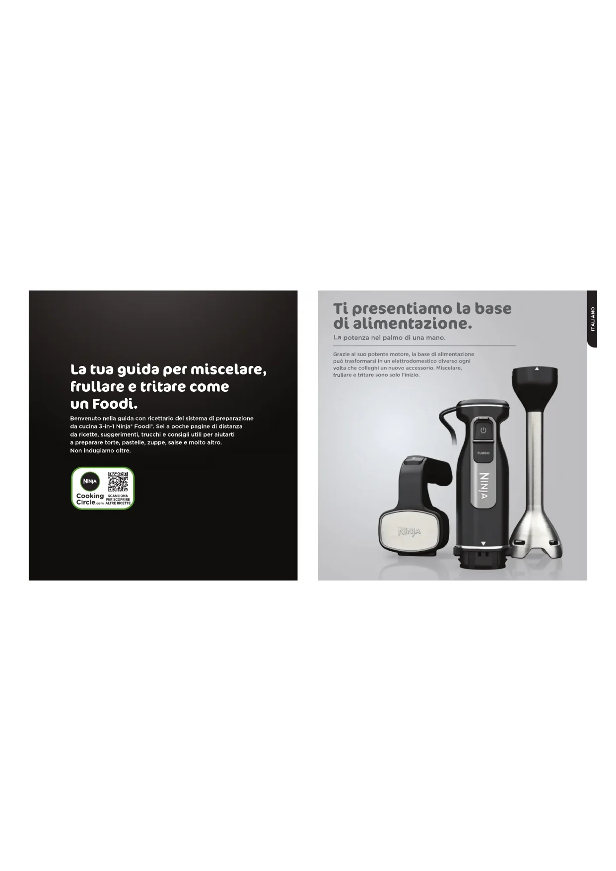INSTRUCCIONES 1. Precalienta el horno a 150°C y forra una bandeja para hornear con papel de horno. 2. En un recipiente grande, añade las claras de huevo y el vinagre. Acopla el accesorio de la batidora amasadora de mano a la base eléctrica y coloca las varillas. Selecciona la potencia para empezar a batir en la velocidad 1 subiendo poco a poco hasta la velocidad 4, hasta que se formen picos suaves. Mezcla el azúcar y la harina de maíz. Añade la mezcla del azúcar, en cucharadas, hasta que el merengue esté brillante.3. Extiende el merengue sobre papel de hornear para formar un círculo de aproximadamente 26cm de ancho y 3-4cm de grosor en los lados. 4. Hornea durante 1hora. Al final de la cocción, apaga el horno y deja que la pavlova se enfríe dentro. 5. Mientras tanto, en un recipiente, añade la nata y el azúcar glas. Acopla el accesorio de la batidora amasadora de mano a la base eléctrica y coloca las varillas. Selecciona la potencia, presiona la flecha hacia arriba y mezcla comenzando en la velocidad 1 aumentando lentamente a la velocidad 5 hasta que la nata comience a coger forma.6. Extiende una capa gruesa de nata para montar sobre la pavlova y decora con bayas. Sirve inmediatamente. INGREDIENTES 4claras de huevo a temperatura ambiente 1cucharadita de vinagre de vino blanco 180g de azúcar 1 cucharadita de harina de maíz 300ml de nata para montar 1 cucharada de azúcar glas 300g de bayas frescas PREP.: 10MINUTOS COCCIÓN: 1 HORA + 15 MINUTOS DE ENFRIADO EN EL HORNO CANTIDAD: 6-8 RACIONES ACCESORIOS: BATIDORA AMASADORA DE MANO + VARILLAS LEBKUCHEN PREP.: 25MINUTOS, MÁS 30MINUTOS DE ENFRIAMIENTO COCCIÓN: 15MINUTOS CANTIDAD: 20RACIONES ACCESORIOS: PICADORA + BATIDORA AMASADORA DE MANO + VARILLAS 5. En un recipiente mediano, mezcla las avellanas molidas, la harina, las almendras molidas, el cacao, las especias, la levadura y el bicarbonato de sodio. 6. En un recipiente grande, coloca el azúcar moreno, la miel, 50g de mantequilla blanda, la sal marina, la ralladura de 2 limones, la esencia de almendras y el huevo. 7. Acopla el accesorio de la batidora amasadora de mano a la base eléctrica y coloca las varillas. Selecciona la potencia y comienza a batir en la velocidad 1. Aumenta lentamente a la velocidad 3 y bate durante 1-2minutos hasta que quede suave. 8. Añade el café, selecciona la potencia y presiona la flecha hacia arriba para comenzar a mezclar comenzando en la velocidad 1 y aumentando lentamente hasta la velocidad 3. Mezcla durante 30segundos. 9. Añade en el recipiente todos los ingredientes secos excepto las frutas escarchadas. Selecciona la potencia y presiona la flecha hacia arriba para comenzar a batir en la velocidad 1 y aumentando lentamente hasta la velocidad 2. Bate durante 1minuto hasta que se combine todo. Añade la cáscara de los cítricos. Selecciona la potencia y presiona la flecha hacia arriba para comenzar a mezclar comenzando en la velocidad 1 y aumentando lentamente hasta la velocidad 2. Bate hasta que se mezcle durante 15segundos. Deja enfriar la mezcla 30minutos. 10. Precalienta el horno a 180°C y forra dos bandejas grandes para hornear con papel de horno. 11. Divide la mezcla de las lebkuchen en 20 bolas y colócalas separadas unas de otras en las bandejas de horno. Presiónalas hasta alcanzar 1¼ cm de altura, aproximadamente. Hornea durante 15 minutos. Retira y deja enfriar sobre una rejilla. 12. En un recipiente pequeño, mezcla el chocolate fundido y los 10g de mantequilla restantes. Coge las galletas una a una y mételas ligeramente en el chocolate para que se cubra la superficie, y déjalas de nuevo en la rejilla. INGREDIENTES 100g de avellanas 275g de harina de trigo 50g de almendras molidas 2 cucharadas de cacao 3 ½-4 cucharaditas de especias Lebkuchengewürz o mezcla de especias para galletas1½ cucharaditas de levadura en polvo ½ cucharadita de bicarbonato de sodio 150g de azúcar moreno claro 125g de miel 60g de mantequilla sin sal, ablandada y dividida ¼ cucharadita de sal marina fina 2 limones, rallados y 1 cucharada de zumo de limón 1 cucharadita de esencia de almendra 1 huevo mediano 60 ml de café fuerte, frío 50g de frutas escarchadas variadas 100g de chocolate negro, fundido INSTRUCCIONES 1. Instala la cuchilla en el recipiente de la picadora. 2. Mete las avellanas en la picadora. 3. Coloca la tapa de la picadora en el recipiente y, luego, fija la base eléctrica en la tapa. 4. Pulsa el botón de encendido/apagado durante 10segundos hasta que se pique bien. ESPAÑOL BATIDORA AMASADORA DE MANO + VARILLASBATIDORA AMASADORA DE MANO + VARILLAS 110La tua guida per miscelare, frullare e tritare come un Foodi. Benvenuto nella guida con ricettario del sistema di preparazione da cucina 3-in-1 Ninja® Foodi®. Sei a poche pagine di distanza da ricette, suggerimenti, trucchi e consigli utili per aiutarti a preparare torte, pastelle, zuppe, salse e molto altro. Non indugiamo oltre. Grazie al suo potente motore, la base di alimentazione può trasformarsi in un elettrodomestico diverso ogni volta che colleghi un nuovo accessorio. Miscelare, frullare e tritare sono solo l’inizio. Ti presentiamo la base di alimentazione. La potenza nel palmo di una mano. ITALIANOE ora, misceliamo Le basi del mixer Scopri il tuo mixer da vicino Con gli sbattitori, usare la velocità1 per miscelare ingredienti secchi e liquidi. Passare alle velocità3-4 per preparare impasti per biscotti, pastelle, glasse o per schiacciare patate. Usare la velocità4 per montare burro e zucchero. Si sconsiglia l’uso per impasti lievitati, come quelli per pizza o pane. Sbattitori: velocità da 1 a 4 Ganci per impastare: velocità da 1 a 4 Con i ganci per impastare, si consiglia di usare le velocità1-2 per miscelare ingredienti secchi e liquidi. Aumentare velocemente fino alla velocità4 per lavorare l’impasto. Seguire attentamente i tempi di miscelazione riportati nella ricetta. Prestare inoltre attenzione agli aspetti visivi per capire quanto continuare a misce