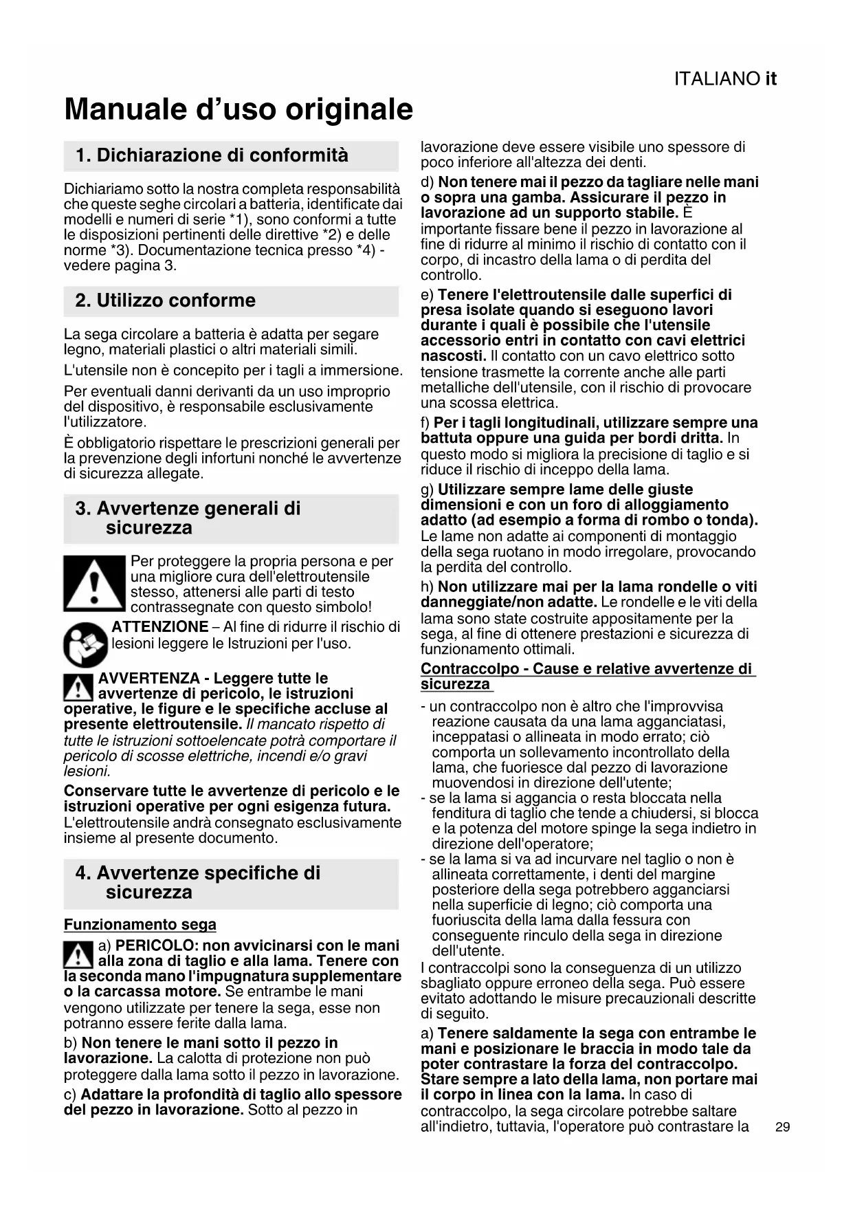 Manuale d’uso originale Dichiariamo sotto la nostra completa responsabilità che queste seghe circolari a batteria, identificate dai modelli e numeri di serie *1), sono conformi a tutte le disposizioni pertinenti delle direttive *2) e delle norme *3). Documentazione tecnica presso *4) - vedere pagina 3. La sega circolare a batteria è adatta per segare legno, materiali plastici o altri materiali simili. L'utensile non è concepito per i tagli a immersione. Per eventuali danni derivanti da un uso improprio del dispositivo, è responsabile esclusivamente l'utilizzatore. È obbligatorio rispettare le prescrizioni generali per la prevenzione degli infortuni nonché le avvertenze di sicurezza allegate. Per proteggere la propria persona e per una migliore cura dell'elettroutensile stesso, attenersi alle parti di testo contrassegnate con questo simbolo! ATTENZIONE – Al fine di ridurre il rischio di lesioni leggere le Istruzioni per l'uso. AVVERTENZA - Leggere tutte le avvertenze di pericolo, le istruzioni operative, le figure e le specifiche accluse al presente elettroutensile. Il mancato rispetto di tutte le istruzioni sottoelencate potrà comportare il pericolo di scosse elettriche, incendi e/o gravi lesioni. Conservare tutte le avvertenze di pericolo e le istruzioni operative per ogni esigenza futura. L'elettroutensile andrà consegnato esclusivamente insieme al presente documento. Funzionamento sega a) PERICOLO: non avvicinarsi con le mani alla zona di taglio e alla lama. Tenere con la seconda mano l'impugnatura supplementare o la carcassa motore. Se entrambe le mani vengono utilizzate per tenere la sega, esse non potranno essere ferite dalla lama. b) Non tenere le mani sotto il pezzo in lavorazione. La calotta di protezione non può proteggere dalla lama sotto il pezzo in lavorazione. c) Adattare la profondità di taglio allo spessore del pezzo in lavorazione. Sotto al pezzo in lavorazione deve essere visibile uno spessore di poco inferiore all'altezza dei denti. d) Non tenere mai il pezzo da tagliare nelle mani o sopra una gamba. Assicurare il pezzo in lavorazione ad un supporto stabile. È importante fissare bene il pezzo in lavorazione al fine di ridurre al minimo il rischio di contatto con il corpo, di incastro della lama o di perdita del controllo. e) Tenere l'elettroutensile dalle superfici di presa isolate quando si eseguono lavori durante i quali è possibile che l'utensile accessorio entri in contatto con cavi elettrici nascosti. Il contatto con un cavo elettrico sotto tensione trasmette la corrente anche alle parti metalliche dell'utensile, con il rischio di provocare una scossa elettrica. f) Per i tagli longitudinali, utilizzare sempre una battuta oppure una guida per bordi dritta. In questo modo si migliora la precisione di taglio e si riduce il rischio di inceppo della lama. g) Utilizzare sempre lame delle giuste dimensioni e con un foro di alloggiamento adatto (ad esempio a forma di rombo o tonda). Le lame non adatte ai componenti di montaggio della sega ruotano in modo irregolare, provocando la perdita del controllo. h) Non utilizzare mai per la lama rondelle o viti danneggiate/non adatte. Le rondelle e le viti della lama sono state costruite appositamente per la sega, al fine di ottenere prestazioni e sicurezza di funzionamento ottimali. Contraccolpo - Cause e relative avvertenze di sicurezza - un contraccolpo non è altro che l'improvvisa reazione causata da una lama agganciatasi, inceppatasi o allineata in modo errato; ciò comporta un sollevamento incontrollato della lama, che fuoriesce dal pezzo di lavorazione muovendosi in direzione dell'utente; - se la lama si aggancia o resta bloccata nella fenditura di taglio che tende a chiudersi, si blocca e la potenza del motore spinge la sega indietro in direzione dell'operatore; - se la lama si va ad incurvare nel taglio o non è allineata correttamente, i denti del margine posteriore della sega potrebbero agganciarsi nella superficie di legno; ciò comporta una fuoriuscita della lama dalla fessura con conseguente rinculo della sega in direzione dell'utente. I contraccolpi sono la conseguenza di un utilizzo sbagliato oppure erroneo della sega. Può essere evitato adottando le misure precauzionali descritte di seguito. a) Tenere saldamente la sega con entrambe le mani e posizionare le braccia in modo tale da poter contrastare la forza del contraccolpo. Stare sempre a lato della lama, non portare mai il corpo in linea con la lama. In caso di contraccolpo, la sega circolare potrebbe saltare all'indietro, tuttavia, l'operatore può contrastare la