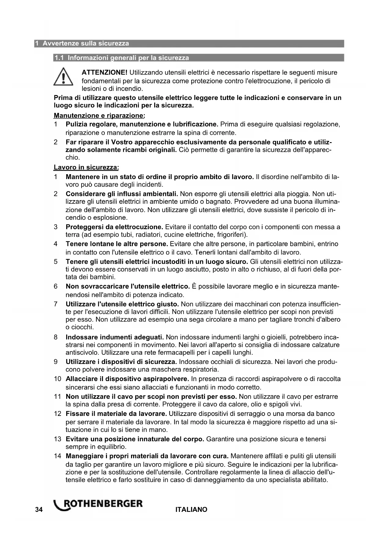 ATTENZIONE! Utilizzando utensili elettrici è necessario rispettare le seguenti misure fondamentali per la sicurezza come protezione contro l'elettrocuzione, il pericolo di lesioni o di incendio. Prima di utilizzare questo utensile elettrico leggere tutte le indicazioni e conservare in un luogo sicuro le indicazioni per la sicurezza. Manutenzione e riparazione: 1 Pulizia regolare, manutenzione e lubrificazione. Prima di eseguire qualsiasi regolazione, riparazione o manutenzione estrarre la spina di corrente. 2 Far riparare il Vostro apparecchio esclusivamente da personale qualificato e utiliz- zando solamente ricambi originali. Ciò permette di garantire la sicurezza dell'apparec- chio. Lavoro in sicurezza: 1 Mantenere in un stato di ordine il proprio ambito di lavoro. Il disordine nell'ambito di la- voro può causare degli incidenti. 2 Considerare gli influssi ambientali. Non esporre gli utensili elettrici alla pioggia. Non uti- lizzare gli utensili elettrici in ambiente umido o bagnato. Provvedere ad una buona illumina- zione dell'ambito di lavoro. Non utilizzare gli utensili elettrici, dove sussiste il pericolo di in- cendio o esplosione. 3 Proteggersi da elettrocuzione. Evitare il contatto del corpo con i componenti con messa a terra (ad esempio tubi, radiatori, cucine elettriche, frigoriferi). 4 Tenere lontane le altre persone. Evitare che altre persone, in particolare bambini, entrino in contatto con l'utensile elettrico o il cavo. Tenerli lontani dall'ambito di lavoro. 5 Tenere gli utensili elettrici incustoditi in un luogo sicuro. Gli utensili elettrici non utilizza- ti devono essere conservati in un luogo asciutto, posto in alto o richiuso, al di fuori della por- tata dei bambini. 6 Non sovraccaricare l'utensile elettrico. È possibile lavorare meglio e in sicurezza mante- nendosi nell'ambito di potenza indicato. 7 Utilizzare l'utensile elettrico giusto. Non utilizzare dei macchinari con potenza insufficien- te per l'esecuzione di lavori difficili. Non utilizzare l'utensile elettrico per scopi non previsti per esso. Non utilizzare ad esempio una sega circolare a mano per tagliare tronchi d'albero o ciocchi. 8 Indossare indumenti adeguati. Non indossare indumenti larghi o gioielli, potrebbero inca- strarsi nei componenti in movimento. Nei lavori all'aperto si consiglia di indossare calzature antiscivolo. Utilizzare una rete fermacapelli per i capelli lunghi. 9 Utilizzare i dispositivi di sicurezza. Indossare occhiali di sicurezza. Nei lavori che produ- cono polvere indossare una maschera respiratoria. 10 Allacciare il dispositivo aspirapolvere. In presenza di raccordi aspirapolvere o di raccolta sincerarsi che essi siano allacciati e funzionanti in modo corretto. 11 Non utilizzare il cavo per scopi non previsti per esso. Non utilizzare il cavo per estrarre la spina dalla presa di corrente. Proteggere il cavo da calore, olio e spigoli vivi. 12 Fissare il materiale da lavorare. Utilizzare dispositivi di serraggio o una morsa da banco per serrare il materiale da lavorare. In tal modo la sicurezza è maggiore rispetto ad una si- tuazione in cui lo si tiene in mano. 13 Evitare una posizione innaturale del corpo. Garantire una posizione sicura e tenersi sempre in equilibrio. 14 Maneggiare i propri materiali da lavorare con cura. Mantenere affilati e puliti gli utensili da taglio per garantire un lavoro migliore e più sicuro. Seguire le indicazioni per la lubrifica- zione e per la sostituzione dell'utensile. Controllare regolarmente la linea di allaccio dell'u- tensile elettrico e farlo sostituire in caso di danneggiamento da uno specialista abilitato.ITALIANO 35 Controllare regolarmente le prolunghe e sostituirle, se danneggiate. Mantenere le impugna- ture asciutte, pulite e prive di grasso e olio. 15 Estrarre la spina dalla presa di corrente. In caso di non utilizzo dell'utensile elettrico, pri- ma della manutenzione e durante la sostituzione di utensili, come ad esempio la lama della sega, il trapano, la fresa. 16 Non lasciare inserita alcuna chiave di utensili. Verificare prima dell'accensione che la chiave e l'utensile di regolazione siano estratti. 17 Evitare una posizione innaturale del corpo. Verificare che l'interruttore sia spento quando si inserisce la spina nella presa di corrente. 18 Utilizzare un cavo di prolunga per l'ambiente esterno. Utilizzare all'aperto solo cavi di prolunga omologati per tale situazione e adeguatamente contrassegnati. 19 Essere accorti. Fare attenzione a cosa si sta facendo. Nel lavoro procedere con raziocinio. Non utilizzare l'utensile elettrico se non si è concentrati. 20 Verificare la presenza di eventuali danni sull'utensile elettrico. Prima di continuare ad utilizzare l'utensile elettrico esaminare attentamente il funzionamento perfetto e adeguato al- lo scopo di utilizzo dei dispositivi di protezione o dei componenti che si danneggiano facil- mente. Verificare che i componenti in movimento funzionino in modo perfetto e non siano incastrati e che non ci siano componenti danneggiati. Tutti i componenti devono essere montati in modo corretto e adempiere a tutte le condizioni per garantire un esercizio inecce- pibile dell'utensile elettrico. I dispositivi di protezione e i componenti danneggiati devono essere riparati o sostituiti da un'officina specializzata abilitata conformemente alle disposizioni, purché le istruzioni per l'uso non riportino disposizioni divergenti. Gli interruttori danneggiati devono essere sostituiti in un'officina autorizzata. Non utilizzare utensili elettrici in cui non sia possibile accendere o spegnere l'interruttore. 21 Attenzione. L'utilizzo di utensili e accessori diversi può comportare un pericolo di lesioni. 22 Far riparare il proprio utensile elettrico da uno specialista elettrotecnico. Questo uten- sile elettrico è conforme alle disposizioni specifiche in materia di sicurezza. Le riparazioni possono essere eseguite solo da uno specialista elettrotecnico che utilizza ricambi originali; altrimenti possono verifi