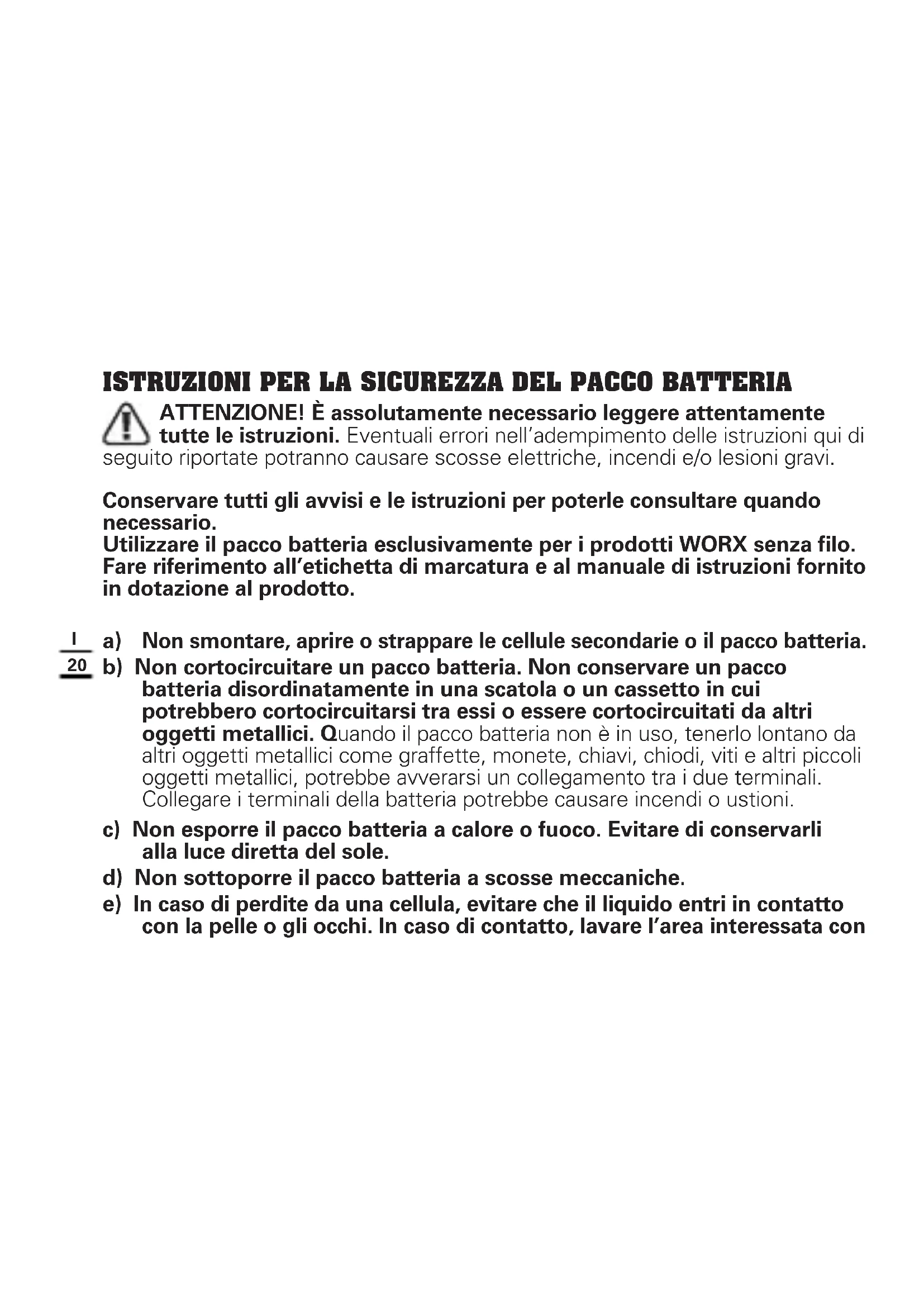 ISTRUZIONI PER LA SICUREZZA DEL PACCO BATTERIA ATTENZIONE! È assolutamente necessario leggere attentamente tutte le istruzioni. Eventuali errori nell’adempimento delle istruzioni qui di seguito riportate potranno causare scosse elettriche, incendi e/o lesioni gravi. Conservare tutti gli avvisi e le istruzioni per poterle consultare quando necessario. Utilizzare il pacco batteria esclusivamente per i prodotti WORX senza filo. Fare riferimento all’etichetta di marcatura e al manuale di istruzioni fornito in dotazione al prodotto.