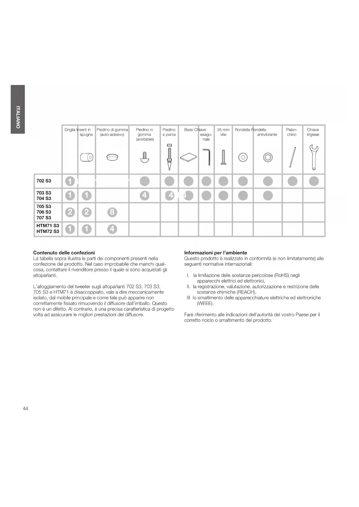 ITALIANO Contenuto delle confezioni La tabella sopra illustra le parti dei componenti presenti nella confezione del prodotto. Nel caso improbabile che manchi qual- cosa, contattare il rivenditore presso il quale si sono acquistati gli altoparlanti. L’alloggiamento del tweeter sugli altoparlanti 702 S3, 703 S3, 705S3 e HTM71 è disaccoppiato, vale a dire meccanicamente isolato, dal mobile principale e come tale può apparire non correttamente ssato rimuovendo il diffusore dall’imballo. Questo non è un difetto. Al contrario, è una precisa caratteristica di progetto volta ad assicurare le migliori prestazioni del diffusore. Informazioni per l’ambiente Questo prodotto è realizzato in conformità (e non limitatamente) alle seguenti normative internazionali: