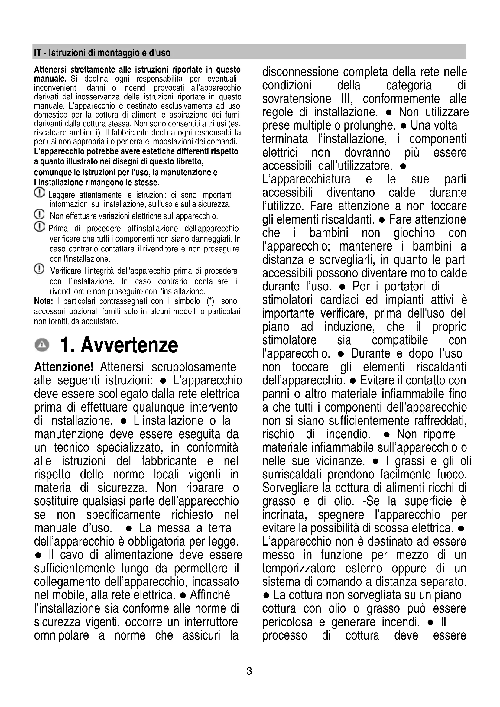 IT - Istruzioni di montaggio e d'uso Attenersi strettamente alle istruzioni riportate in questo manuale. Si declina ogni responsabilità per eventuali inconvenienti, danni o incendi provocati all'apparecchio derivati dall'inosservanza delle istruzioni riportate in questo manuale. L’apparecchio è destinato esclusivamente ad uso domestico per la cottura di alimenti e aspirazione dei fumi derivanti dalla cottura stessa. Non sono consentiti altri usi (es. riscaldare ambienti). Il fabbricante declina ogni responsabilità per usi non appropriati o per errate impostazioni dei comandi. L'apparecchio potrebbe avere estetiche differenti rispetto a quanto illustrato nei disegni di questo libretto, comunque le istruzioni per l'uso, la manutenzione e l'installazione rimangono le stesse. Leggere attentamente le istruzioni: ci sono importanti informazioni sull'installazione, sull'uso e sulla sicurezza. Non effettuare variazioni elettriche sull'apparecchio. Prima di procedere all'installazione dell'apparecchio verificare che tutti i componenti non siano danneggiati. In caso contrario contattare il rivenditore e non proseguire con l'installazione. Verificare l'integrità dell'apparecchio prima di procedere con l’installazione. In caso contrario contattare il rivenditore e non proseguire con l'installazione. Nota: I particolari contrassegnati con il simbolo "(*)" sono accessori opzionali forniti solo in alcuni modelli o particolari non forniti, da acquistare.
