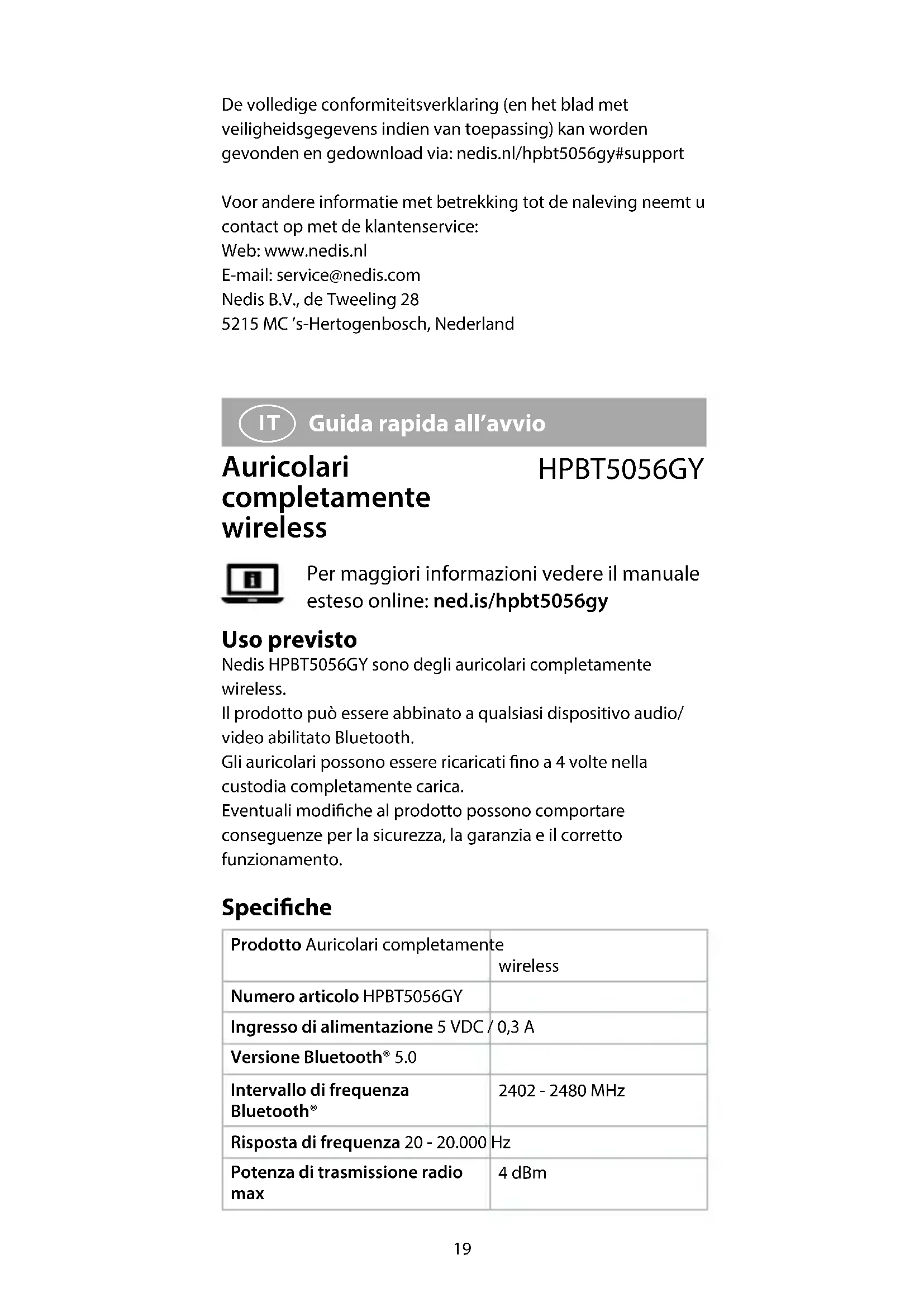 prodotto in Cina, è stato collaudato ai sensi di tutte le norme e i regolamenti CE pertinenti e che tutti i collaudi sono stati superati con successo. Questo include, senza esclusione alcuna, la normativa RED 2014/53/UE.23 La Dichiarazione di conformità completa (e le schede di sicurezza, se applicabili) sono disponibili e possono essere scaricate da: nedis.it/hpbt5056gy#support Per ulteriori informazioni relative alla conformità, contattare il servizio clienti: Sito web: www.nedis.com E-mail: service@nedis.com Nedis B.V., de Tweeling 28 5215 MC ’s-Hertogenbosch, Paesi Bassi