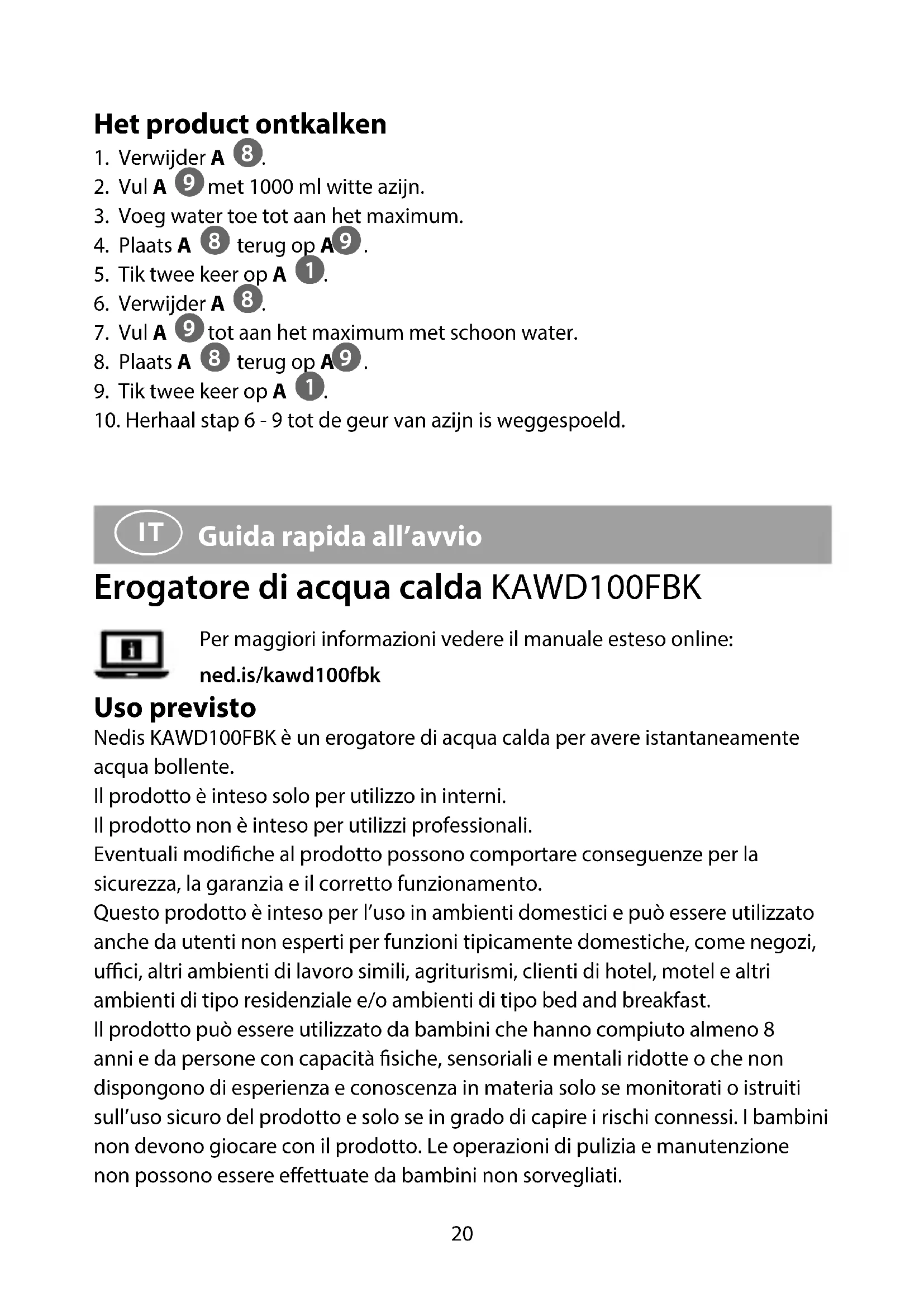 Guida rapida all’avvio Erogatore di acqua calda KAWD100FBK Per maggiori informazioni vedere il manuale esteso online: ned.is/kawd100fbk Uso previsto Nedis KAWD100FBK è un erogatore di acqua calda per avere istantaneamente acqua bollente. Il prodotto è inteso solo per utilizzo in interni. Il prodotto non è inteso per utilizzi professionali. Eventuali modiche al prodotto possono comportare conseguenze per la sicurezza, la garanzia e il corretto funzionamento. Questo prodotto è inteso per l’uso in ambienti domestici e può essere utilizzato anche da utenti non esperti per funzioni tipicamente domestiche, come negozi, uci, altri ambienti di lavoro simili, agriturismi, clienti di hotel, motel e altri ambienti di tipo residenziale e/o ambienti di tipo bed and breakfast. Il prodotto può essere utilizzato da bambini che hanno compiuto almeno 8 anni e da persone con capacità siche, sensoriali e mentali ridotte o che non dispongono di esperienza e conoscenza in materia solo se monitorati o istruiti sull’uso sicuro del prodotto e solo se in grado di capire i rischi connessi. I bambini non devono giocare con il prodotto. Le operazioni di pulizia e manutenzione non possono essere eettuate da bambini non sorvegliati. KAWD100FBK_MAN_COMP_0520_print_(20161 1422)_v00.01.indd 20KAWD100FBK_MAN_COMP_0520_print_(20161 1422)_v00.01.indd 20 18-05-2020 09:0818-05-2020 09:0821 Speciche Prodotto Erogatore di acqua calda Numero articolo KAWD100FBK Dimensioni (p x l x a) 240 x 140 x 300 mm Peso 1595 g Alimentazione 220 - 240 VAC / 50/60 Hz Consumo di corrente 2200 - 2600 W Potenza in standby 0,5 W Quantità d’acqua 0,5 - 2,5 L Parti principali (immagine A)