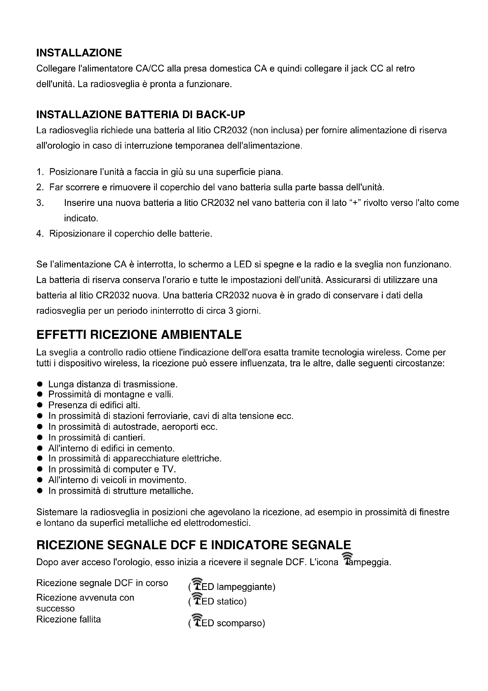 La radiosveglia richiede una batteria al litio CR2032 (non inclusa) per fornire alimentazione di riserva all'orologio in caso di interruzione temporanea dell'alimentazione.