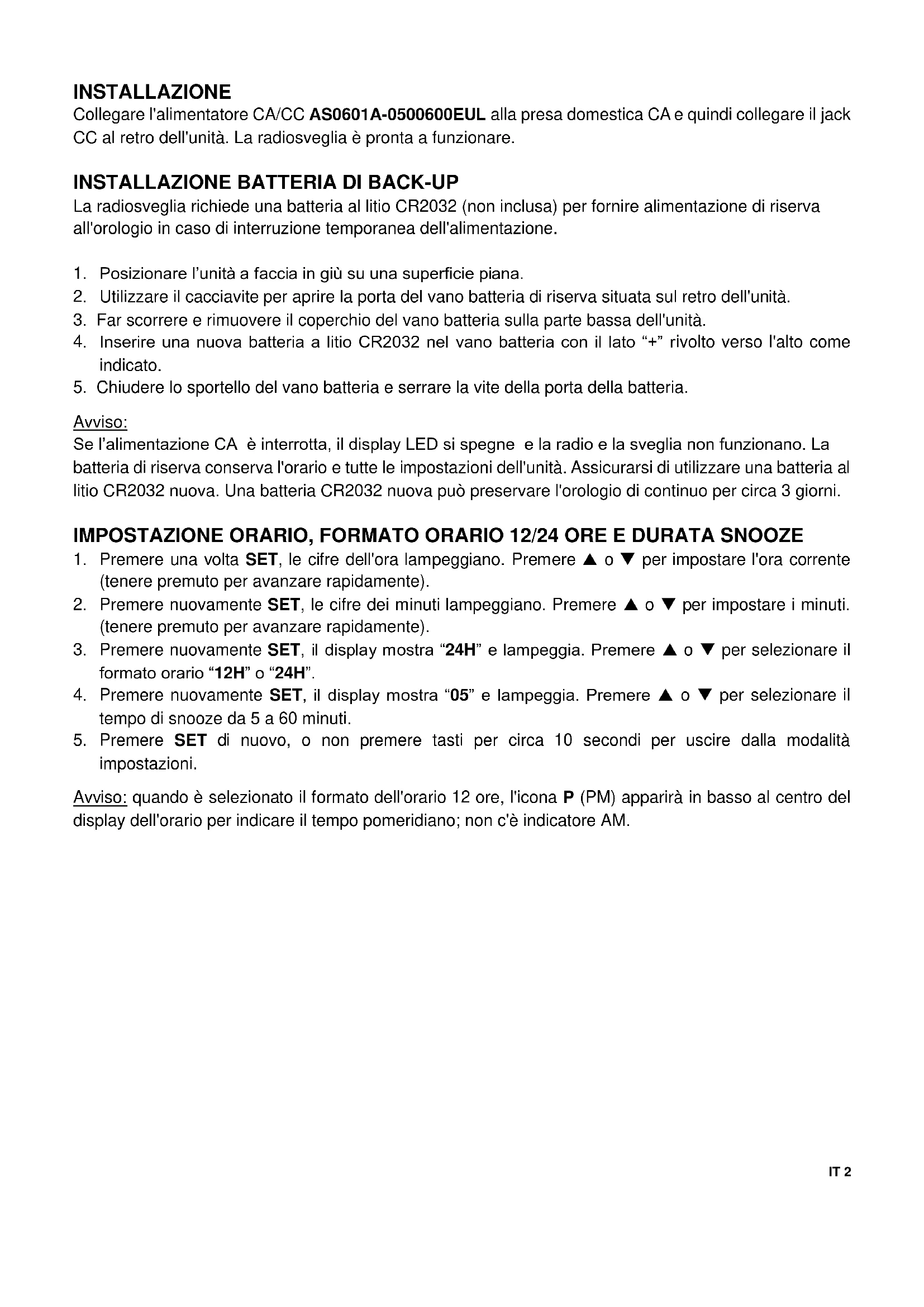Avviso: Se l’alimentazione CA è interrotta, il display LED si spegne e la radio e la sveglia non funzionano. La batteria di riserva conserva l'orario e tutte le impostazioni dell'unità. Assicurarsi di utilizzare una batteria al litio CR2032 nuova. Una batteria CR2032 nuova può preservare l'orologio di continuo per circa 3 giorni. IMPOSTAZIONE ORARIO, FORMATO ORARIO 12/24 ORE E DURATA SNOOZE