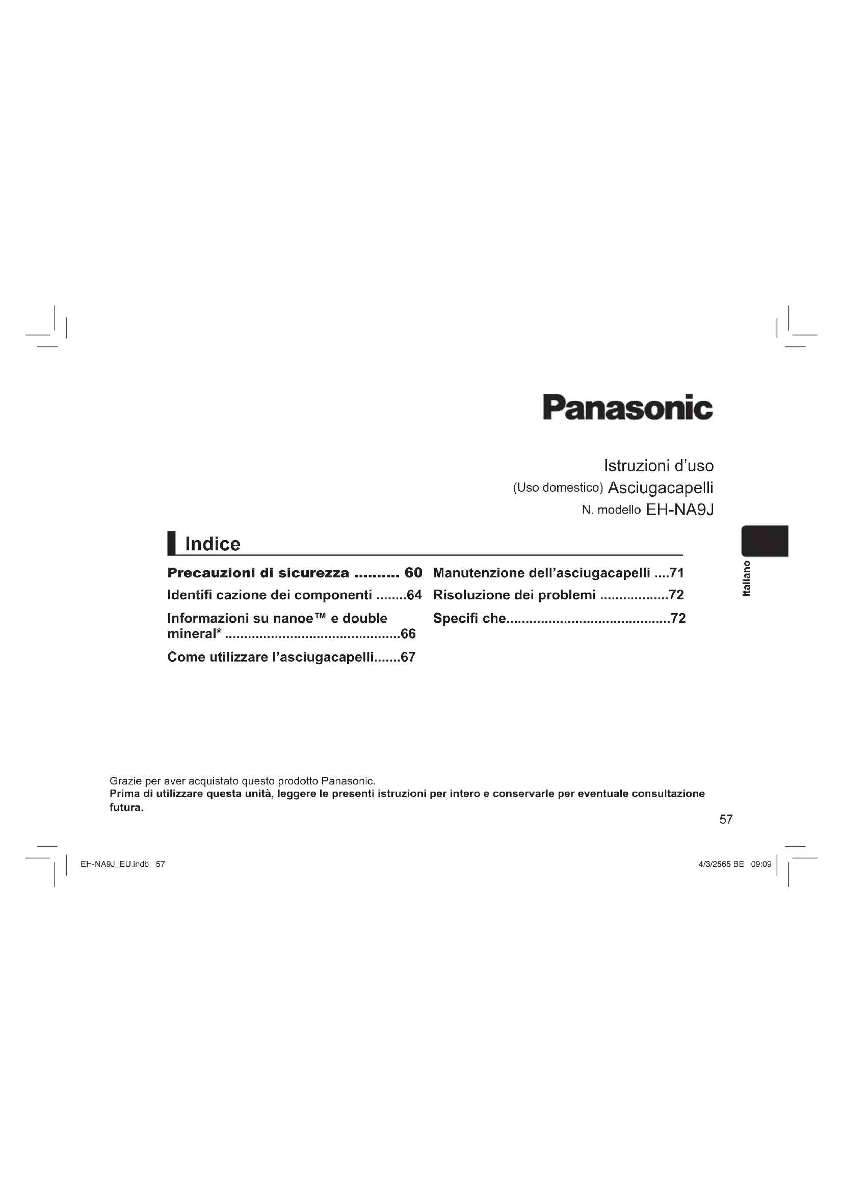 Scarica le istruzioni per il tuo Asciugacapelli in formato PDF gratuitamente! Trova il tuo manuale EHNA9J - PANASONIC e riprendi in mano il tuo dispositivo elettronico. In questa pagina sono pubblicati tutti i documenti necessari per l'utilizzo del tuo dispositivo. EHNA9J del marchio PANASONIC.