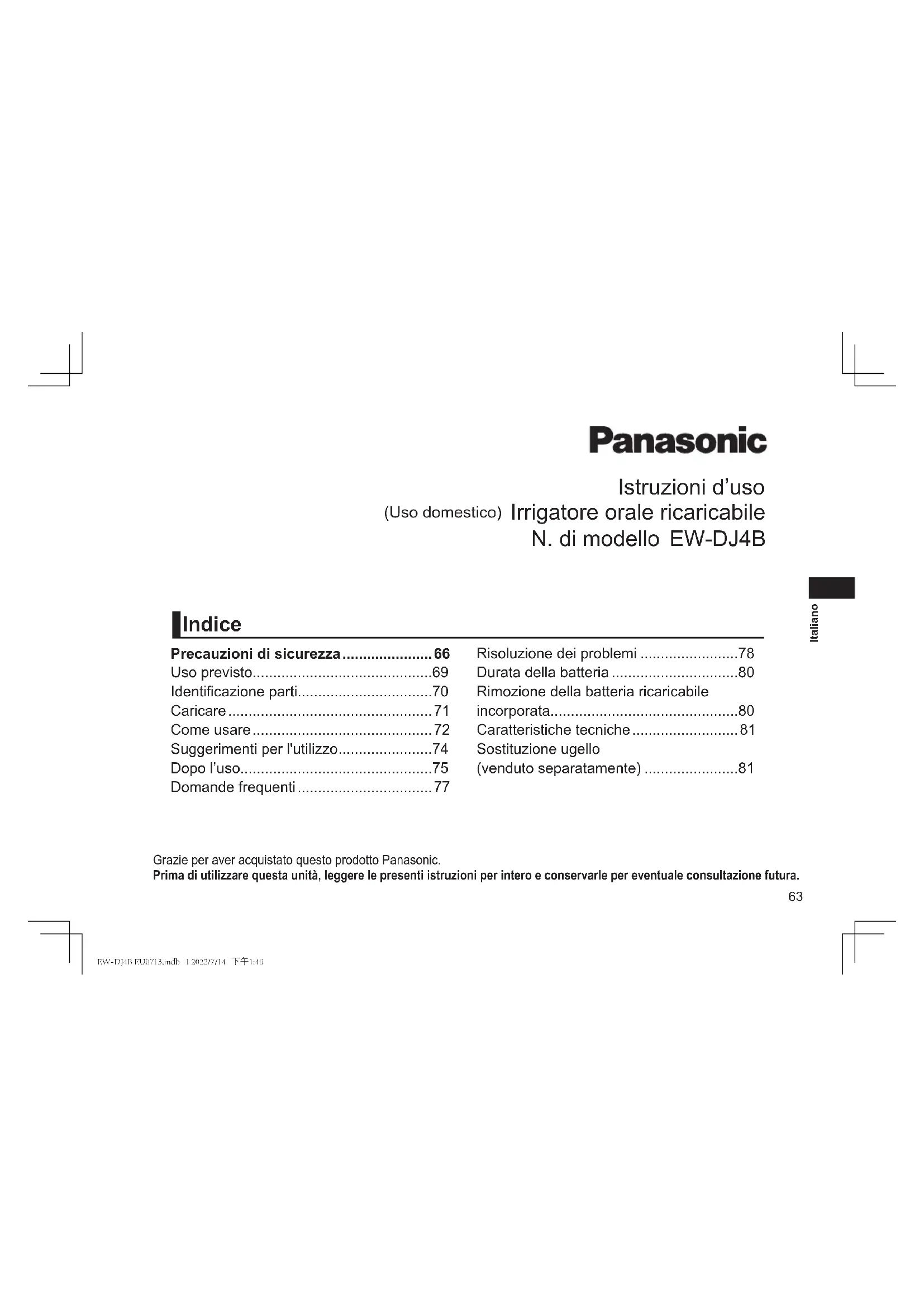 - EW-DJ4B EU0713.indb 20 2022/7/14 下午1:40Italiano Grazie per aver acquistato questo prodotto Panasonic. Prima di utilizzare questa unità, leggere le presenti istruzioni per intero e conservarle per eventuale consultazione futura. Indice Istruzioni d’uso (Uso domestico) Irrigatore orale ricaricabile N. di modello EW-DJ4B Precauzioni di sicurezza p. 66