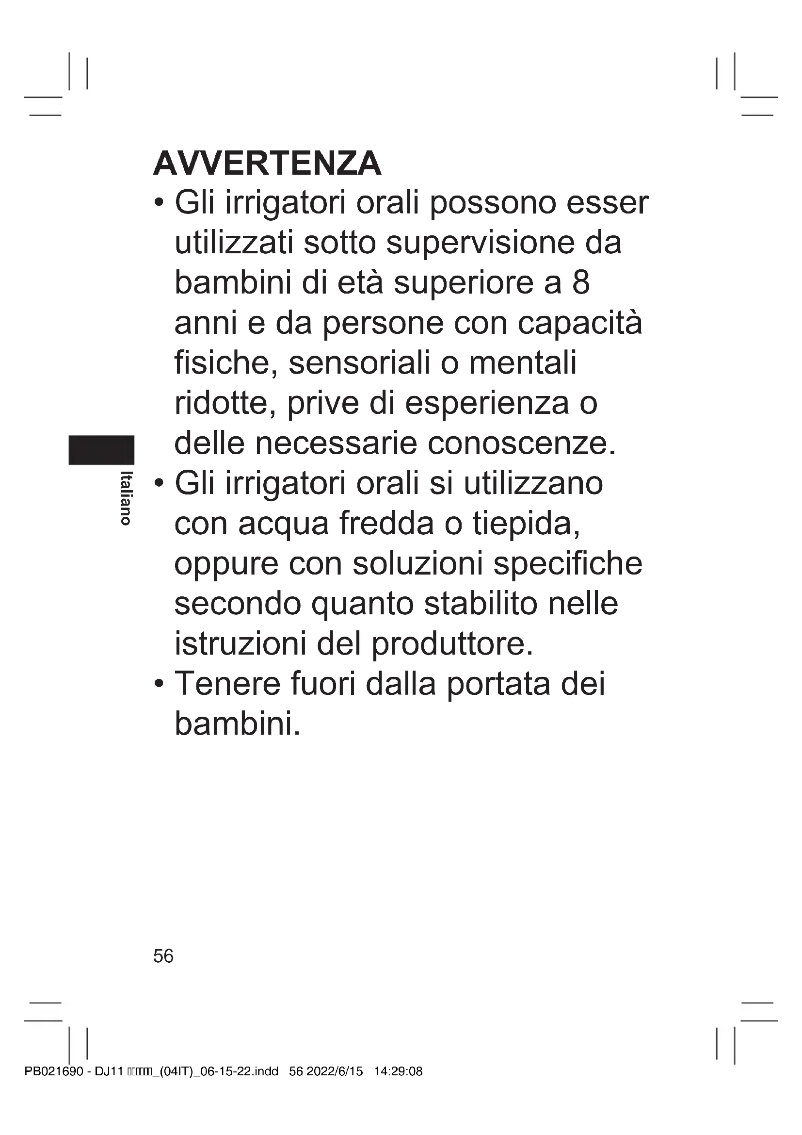- Il dispositivo non deve essere usato da persone con alta sensibilità alla cavità orale. - Potrebbe altrimenti causare lesioni o danni a denti e gengive. Non usare mai per uno scopo diverso da quello della pulizia orale. - Ciò potrebbe causare incidenti o lesioni quando il gettod’acquaèpuntatoversogliocchi,ilnaso,le orecchie,lalinguaolagola. Non riempire il contenitore con acqua a una temperatura superiore a 40 °C. - Ciò potrebbe causare ustioni. Non condividere l'ugello con la tua famiglia o altre persone. -Ciòpotrebbecausareinfezionioinammazioni. PB021690 - DJ11 _(04IT)_06-15-22.indd 58 2022/6/15 14:29:0859 Italiano ATTENZIONE Non farlo cadere né sottoporlo a urti. - Farlo potrebbe provocare lesioni. Le batterie dei terminali di alimentazione non devono essere cortocircuitati. - Farlo potrebbe causare ustioni o lesioni. Le persone che possono avere malattie parodontali, denti trattati, o sono interessate da sintomi all’interno della loro bocca devono consultare un dentista prima dell’uso. - Potrebbe causare lesioni o danni a denti e gengive. Dopo l'uso, pulire il corpo principale, il serbatoio e l'ugello e asciugarli. - La mancata osservanza di questa precauzione potrebbe causare danni alla salute a causa della propagazione di muffe e batteri.