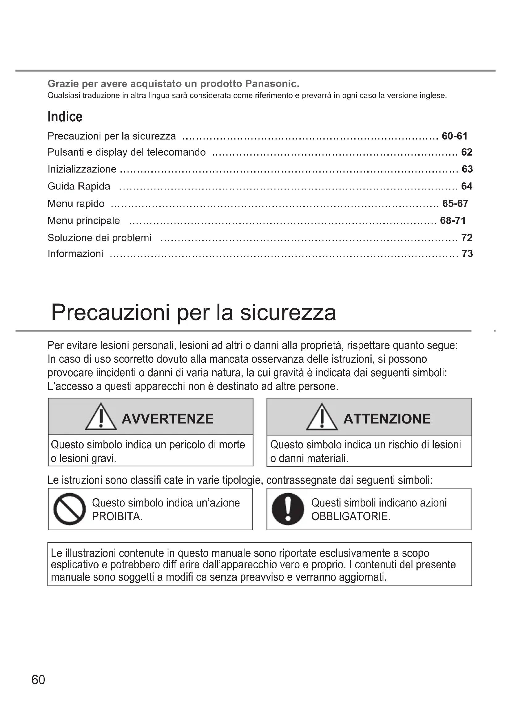 Deutsch Memo60 Precauzioni per la sicurezza AVVERTENZE Questo simbolo indica un pericolo di morte o lesioni gravi. ATTENZIONE Questo simbolo indica un rischio di lesioni o danni materiali. Per evitare lesioni personali, lesioni ad altri o danni alla proprietà, rispettare quanto segue: In caso di uso scorretto dovuto alla mancata osservanza delle istruzioni, si possono provocare iincidenti o danni di varia natura, la cui gravità è indicata dai seguenti simboli: L’accesso a questi apparecchi non è destinato ad altre persone. Le istruzioni sono classifi cate in varie tipologie, contrassegnate dai seguenti simboli: Questo simbolo indica un’azione PROIBITA. Questi simboli indicano azioni OBBLIGATORIE. Le illustrazioni contenute in questo manuale sono riportate esclusivamente a scopo esplicativo e potrebbero diff erire dall’apparecchio vero e proprio. I contenuti del presente manuale sono soggetti a modifi ca senza preavviso e verranno aggiornati. Indice Precauzioni per la sicurezza ………………………………………………………………… 60-61Pulsanti e display del telecomando ……………………………………………………………… 62Inizializzazione ……………………………………………………………………………………… 63Guida Rapida ……………………………………………………………………………………… 64Menu rapido …………………………………………………………………………………… 65-67Menu principale ……………………………………………………………………………… 68-71Soluzione dei problemi …………………………………………………………………………… 72Informazioni ………………………………………………………………………………………… 73Grazie per avere acquistato un prodotto Panasonic.Qualsiasi traduzione in altra lingua sarà considerata come riferimento e prevarrà in ogni caso la versione inglese.61 Italiano Precauzioni per la sicurezza AVVERTENZE Ciò può causare scosse elettriche o combustione.