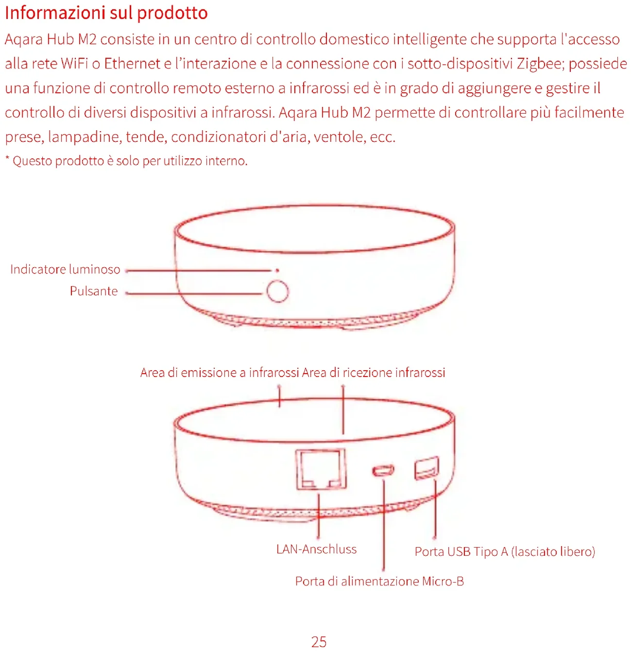 [Hub M2,HM2-G01] mit der Verordnung 2014/53/EU in Einklang steht. Der vollständige Wortlaut der EU-Konformitätserklärung ist unter der folgenden Internetadresse abrufbar: https://www.aqara.com/DoC/Informazioni sul prodotto Aqara Hub M2 consiste in un centro di controllo domestico intelligente che supporta l'accesso alla rete WiFi o Ethernet e l’interazione e la connessione con i sotto-dispositivi Zigbee; possiede una funzione di controllo remoto esterno a infrarossi ed è in grado di aggiungere e gestire il controllo di diversi dispositivi a infrarossi. Aqara Hub M2 permette di controllare più facilmente prese, lampadine, tende, condizionatori d'aria, ventole, ecc.