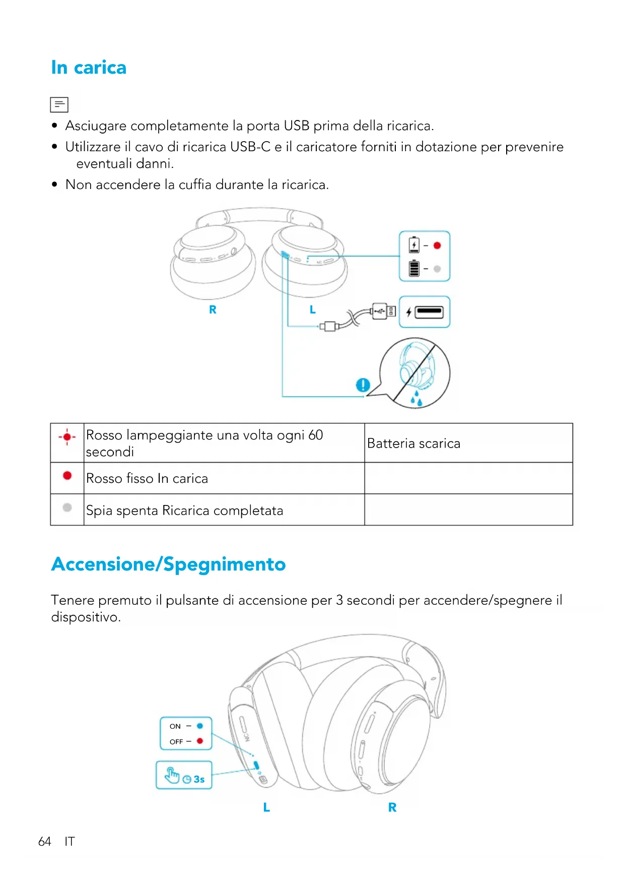 - Non accendere la cufa durante la ricarica. R L Rosso lampeggiante una volta ogni 60 secondi Batteria scarica Rosso sso In carica Spia spenta Ricarica completata Accensione/Spegnimento Tenere premuto il pulsante di accensione per 3 secondi per accendere/spegnere il dispositivo.