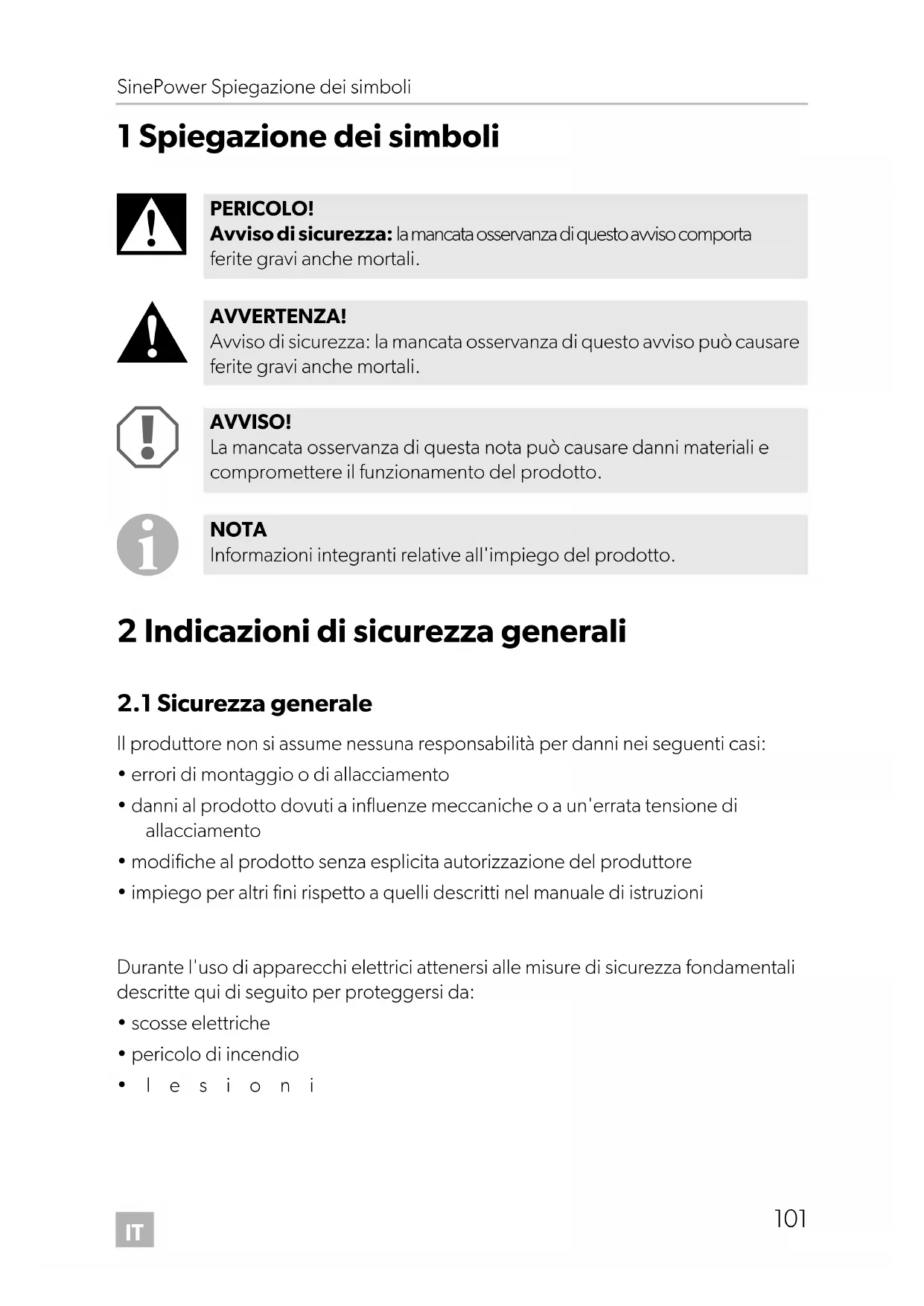 - lesioni PERICOLO! Avviso di sicurezza: la mancata osservanza di questo avviso comporta ferite gravi anche mortali. AVVERTENZA! Avviso di sicurezza: la mancata osservanza di questo avviso può causare ferite gravi anche mortali. AVVISO! La mancata osservanza di questa nota può causare danni materiali e compromettere il funzionamento del prodotto. NOTA Informazioni integranti relative all'impiego del prodotto. DSP600-2000--IO-16s.book Seite 101 Montag, 7. Mai 2018 1:39 13IT Indicazioni di sicurezza generali SinePower