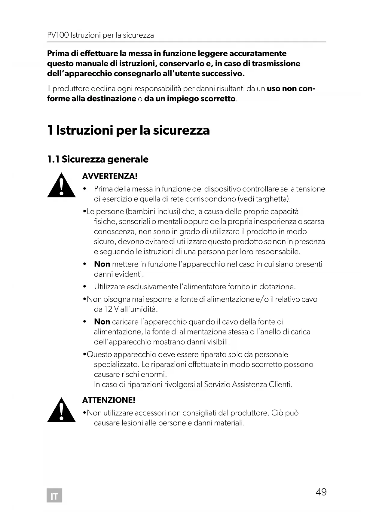 - Non utilizzare accessori non consigliati dal produttore. Ciò può causare lesioni alle persone e danni materiali. PV100-O-16s.book Seite 49 Montag, 29. August 2016 3:47 15IT Istruzioni per la sicurezza PV100
