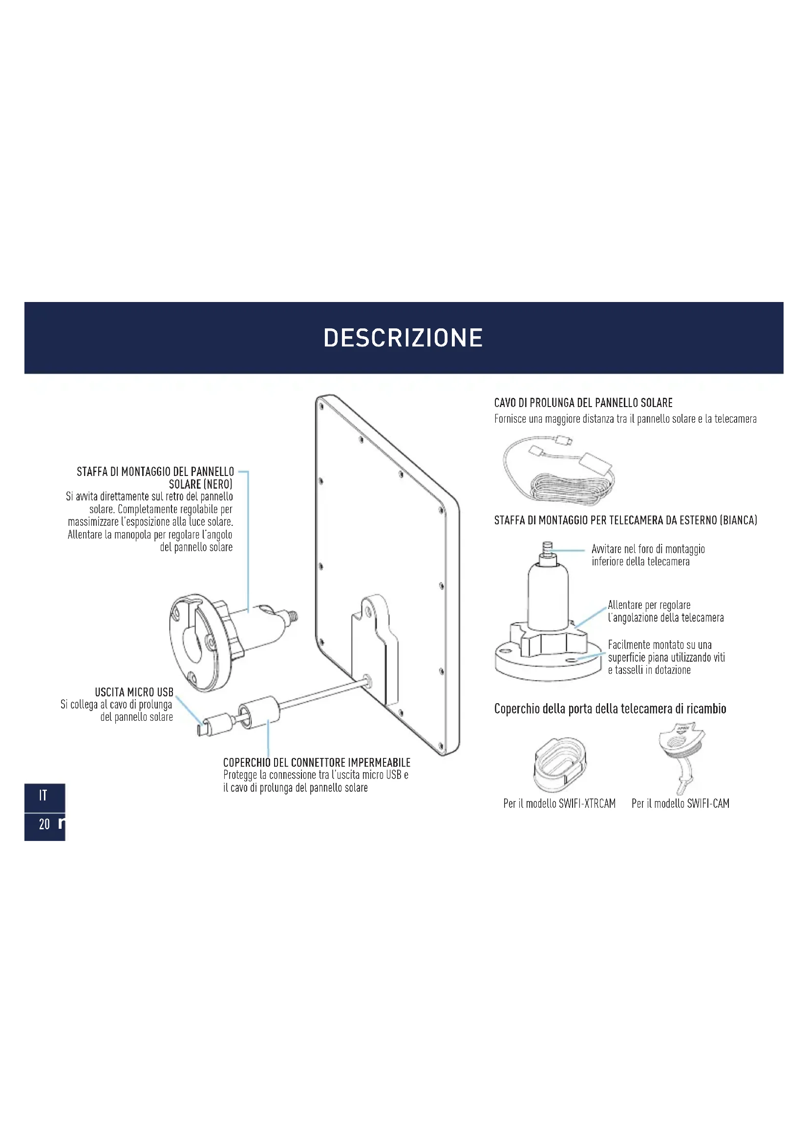 Fornisce una maggiore distanza tra il pannello solare e la telecamera Per il modello SWIFI-CAM Avvitare nel foro di montaggio inferiore della telecamera Allentare per regolare l’angolazione della telecamera Facilmente montato su una superficie piana utilizzando viti e tasselli in dotazione Per il modello SWIFI-XTRCAM21