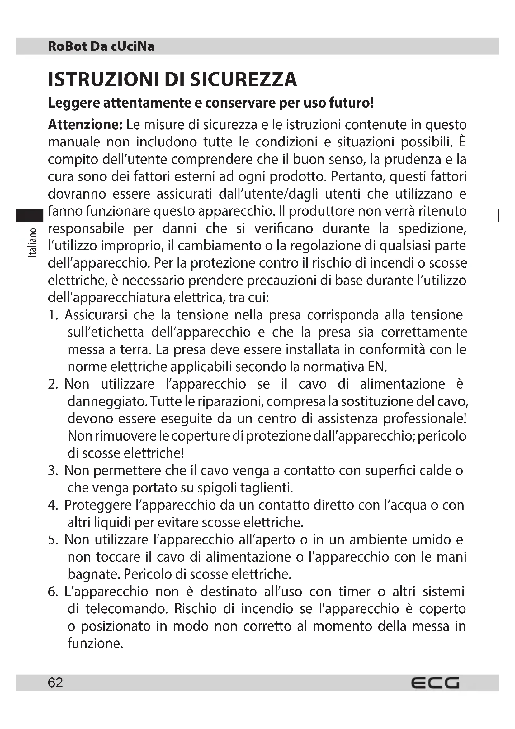 Leggere attentamente e conservare per uso futuro! Attenzione: Le misure di sicurezza e le istruzioni contenute in questo manuale non includono tutte le condizioni e situazioni possibili. È compito dell’utente comprendere che il buon senso, la prudenza e la cura sono dei fattori esterni ad ogni prodotto. Pertanto, questi fattori dovranno essere assicurati dall’utente/dagli utenti che utilizzano e fanno funzionare questo apparecchio. Il produttore non verrà ritenuto responsabile per danni che si vericano durante la spedizione, l’utilizzo improprio, il cambiamento o la regolazione di qualsiasi parte dell’apparecchio. Per la protezione contro il rischio di incendi o scosse elettriche, è necessario prendere precauzioni di base durante l’utilizzo dell’apparecchiatura elettrica, tra cui: