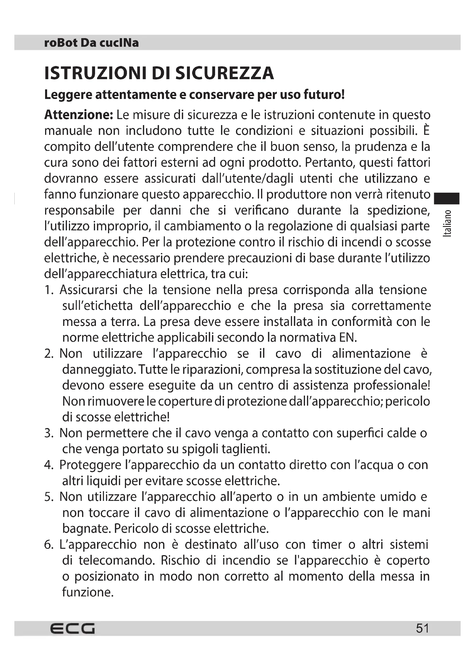 Smaltimento di apparecchiature elettriche ed elettroniche (valido per i Paesi membri dell’Unione Europea e per altri Paesi europei con un sistema di riciclo implementato) Il simbolo rappresentato sul prodotto o sulla confezione signica che il prodotto non deve essere trattato come riuto domestico. Consegnare il prodotto in un luogo indicato per il riciclaggio di apparecchiature elettriche ed elettroniche. Prevenire impatti negativi sulla salute umana e sull’ambiente riciclando correttamente il prodotto. Il riciclaggio contribuisce a preservare le risorse naturali. Per ulteriori informazioni sul riciclaggio di questo prodotto, fare riferimento alle autorità locali, all’organizzazione nazionale di trattamento dei riuti o al negozio dove è stato acquistato il prodotto. Questo prodotto è conforme ai requisiti delle direttive UE sulla compatibilità elettromagnetica, sulla sicurezza elettrica e sull'emissione di metalli pesanti nelle apparecchiature elettriche ed elettroniche. Inoltre, soddisfa i requisiti energetici pertinenti e i requisiti per il contatto diretto con gli alimenti. Il manuale operativo è disponibile sul sito www.ecg-electro.eu. Il produttore si riserva il diritto ad eettuare cambiamenti del testo e dei parametri tecnici. 08/05Latviešu valoda Latviešu valoda