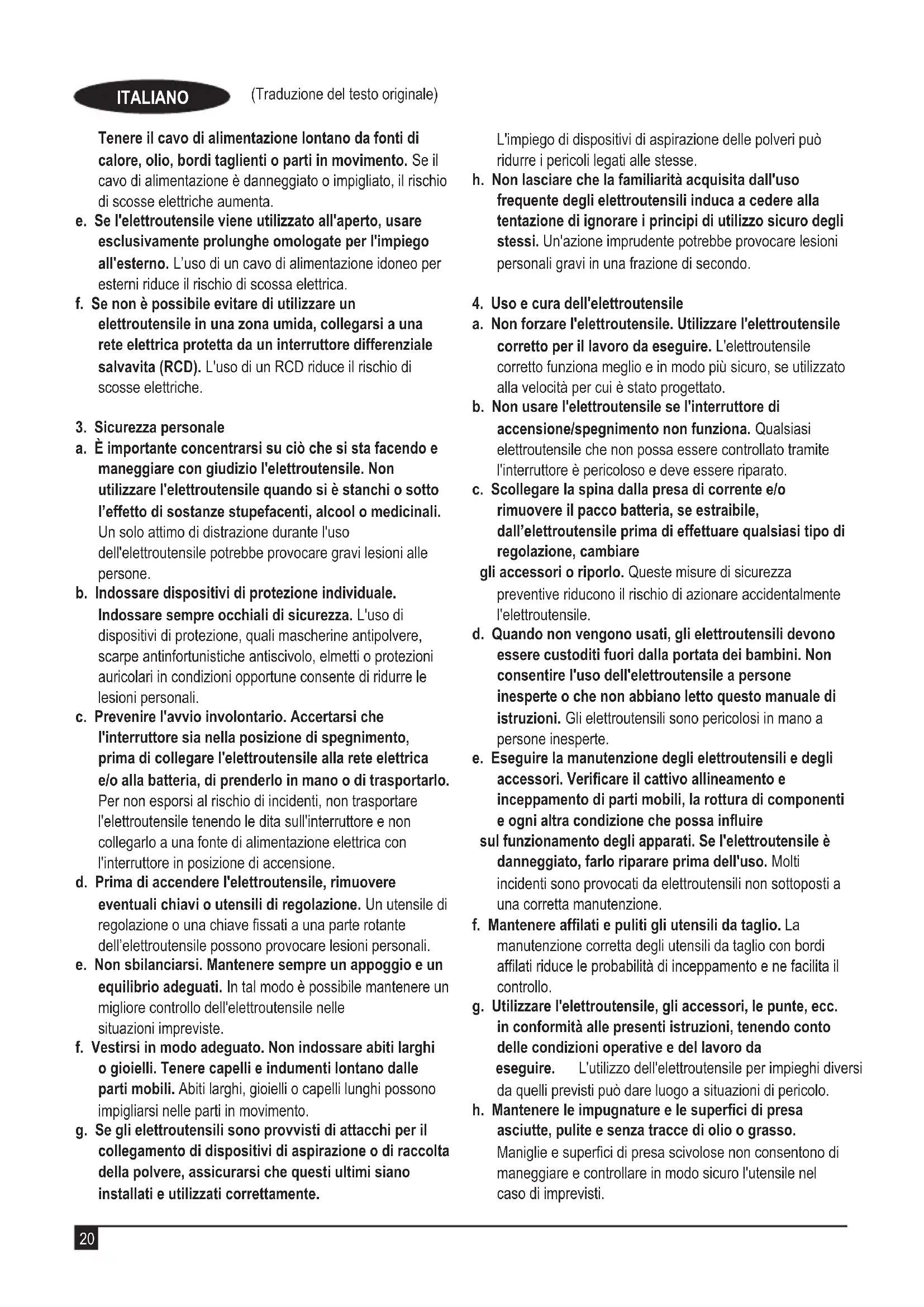 a. Non forzare l'elettroutensile. Utilizzare l'elettroutensile corretto per il lavoro da eseguire. L'elettroutensile corretto funziona meglio e in modo più sicuro, se utilizzato alla velocità per cui è stato progettato. b. Non usare l'elettroutensile se l'interruttore di accensione/spegnimento non funziona. Qualsiasi elettroutensile che non possa essere controllato tramite l'interruttore è pericoloso e deve essere riparato. c. Scollegare la spina dalla presa di corrente e/o rimuovere il pacco batteria, se estraibile, dall’elettroutensile prima di effettuare qualsiasi tipo di regolazione, cambiare gli accessori o riporlo. Queste misure di sicurezza preventive riducono il rischio di azionare accidentalmente l'elettroutensile. d. Quando non vengono usati, gli elettroutensili devono essere custoditi fuori dalla portata dei bambini. Non consentire l'uso dell'elettroutensile a persone inesperte o che non abbiano letto questo manuale di istruzioni. Gli elettroutensili sono pericolosi in mano a persone inesperte. e. Eseguire la manutenzione degli elettroutensili e degli accessori. Vericare il cattivo allineamento e inceppamento di parti mobili, la rottura di componenti e ogni altra condizione che possa inuire sul funzionamento degli apparati. Se l'elettroutensile è danneggiato, farlo riparare prima dell'uso. Molti incidenti sono provocati da elettroutensili non sottoposti a una corretta manutenzione. f. Mantenere aflati e puliti gli utensili da taglio. La manutenzione corretta degli utensili da taglio con bordi aflati riduce le probabilità di inceppamento e ne facilita il controllo. g. Utilizzare l'elettroutensile, gli accessori, le punte, ecc. in conformità alle presenti istruzioni, tenendo conto delle condizioni operative e del lavoro da eseguire. L'utilizzo dell'elettroutensile per impieghi diversi da quelli previsti può dare luogo a situazioni di pericolo. h. Mantenere le impugnature e le superci di presa asciutte, pulite e senza tracce di olio o grasso. Maniglie e superci di presa scivolose non consentono di maneggiare e controllare in modo sicuro l'utensile nel caso di imprevisti.21 (Traduzione del testo originale) ITALIANO