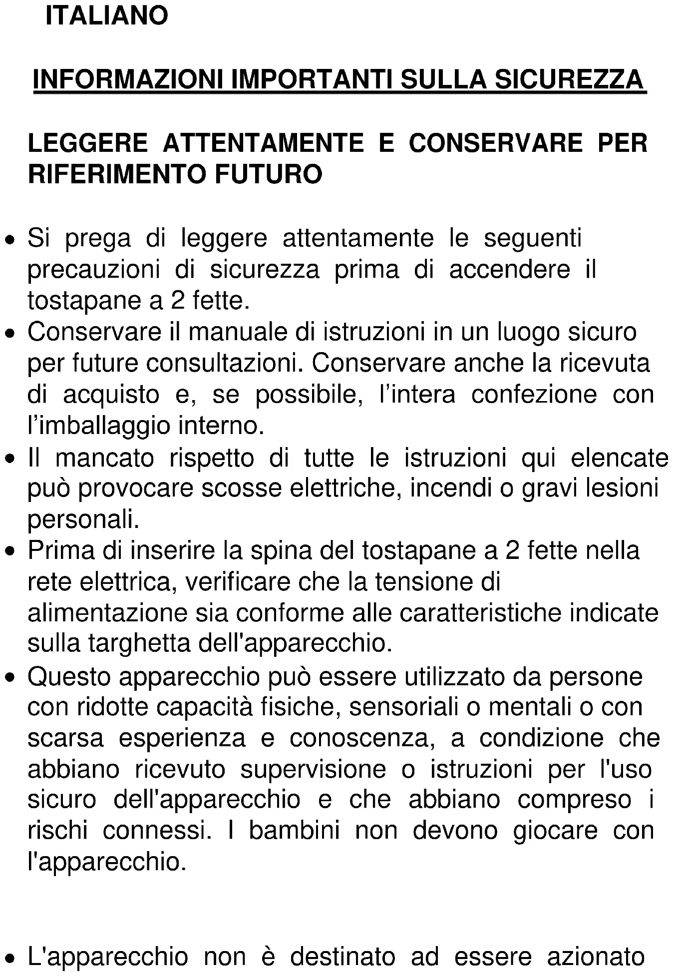 Si prega di leggere attentamente le seguenti precauzioni di sicurezza prima di accendere il tostapane a 2 fette.