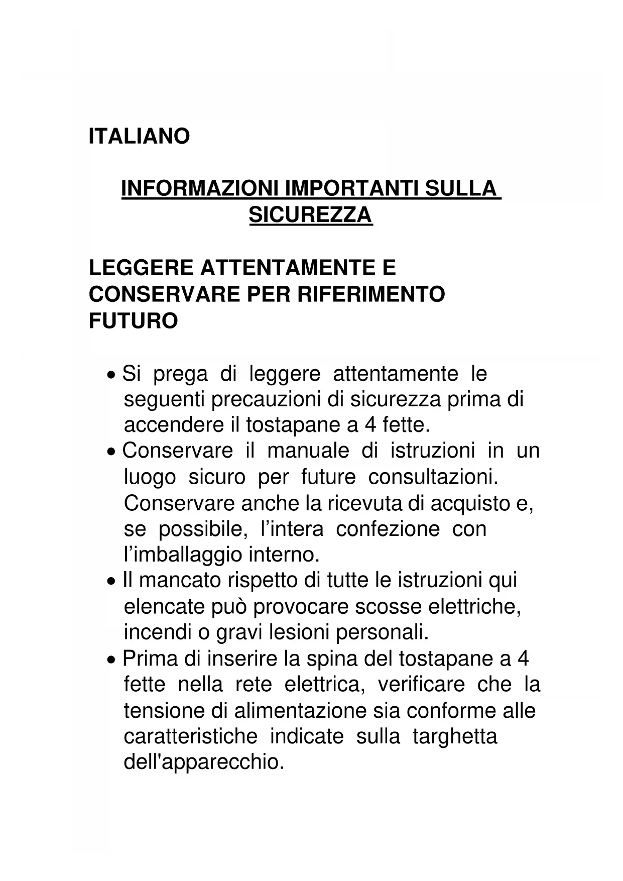 - Prima di inserire la spina del tostapane a 4 fette nella rete elettrica, verificare che la tensione di alimentazione sia conforme alle caratteristiche indicate sulla targhetta dell'apparecchio.• Questo apparecchio può essere utilizzato da persone con ridotte capacità fisiche, sensoriali o mentali o con scarsa esperienza e conoscenza, a condizione che abbiano ricevuto supervisione o istruzioni per l'uso sicuro dell'apparecchio e che abbiano compreso i rischi connessi. I bambini non devono giocare con l'apparecchio.