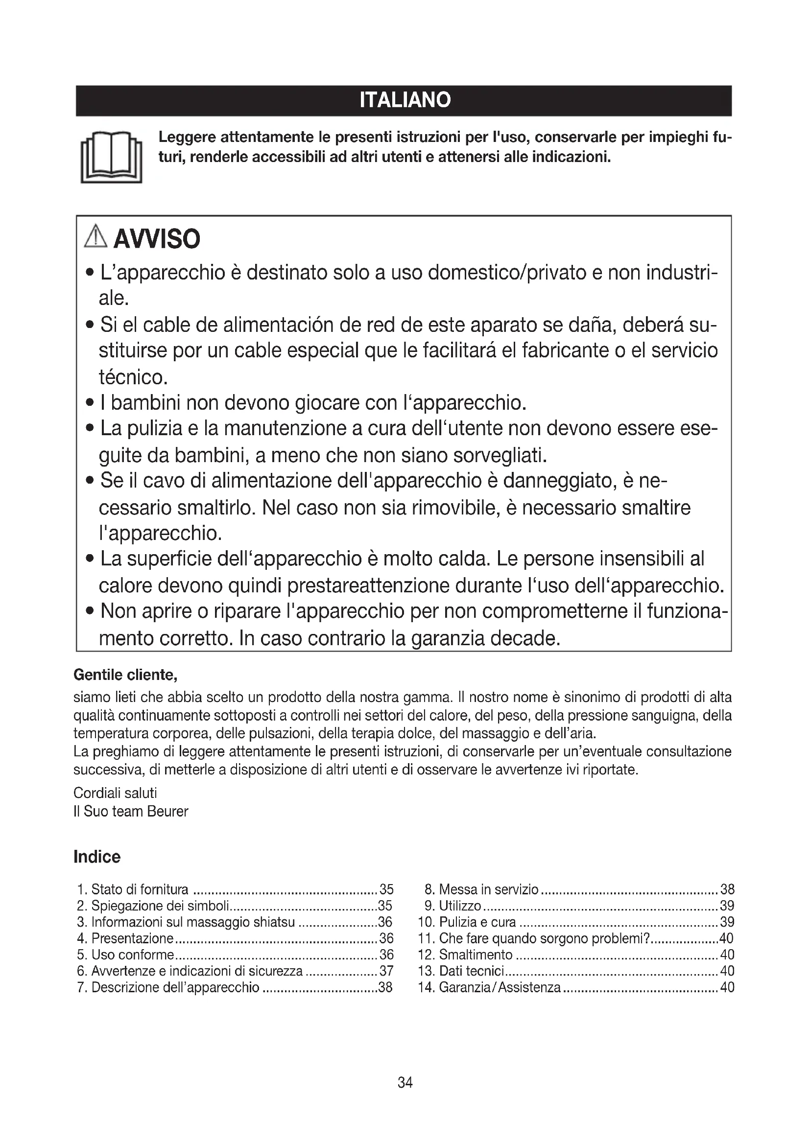 Non aprire o riparare l'apparecchio per non comprometterne il funziona- mento corretto. In caso contrario la garanzia decade. Gentile cliente, siamo lieti che abbia scelto un prodotto della nostra gamma. Il nostro nome è sinonimo di prodotti di alta qualità continuamente sottoposti a controlli nei settori del calore, del peso, della pressione sanguigna, della temperatura corporea, delle pulsazioni, della terapia dolce, del massaggio e dell’aria.La preghiamo di leggere attentamente le presenti istruzioni, di conservarle per un’eventuale consultazione successiva, di metterle a disposizione di altri utenti e di osservare le avvertenze ivi riportate.Cordiali salutiIl Suo team Beurer35