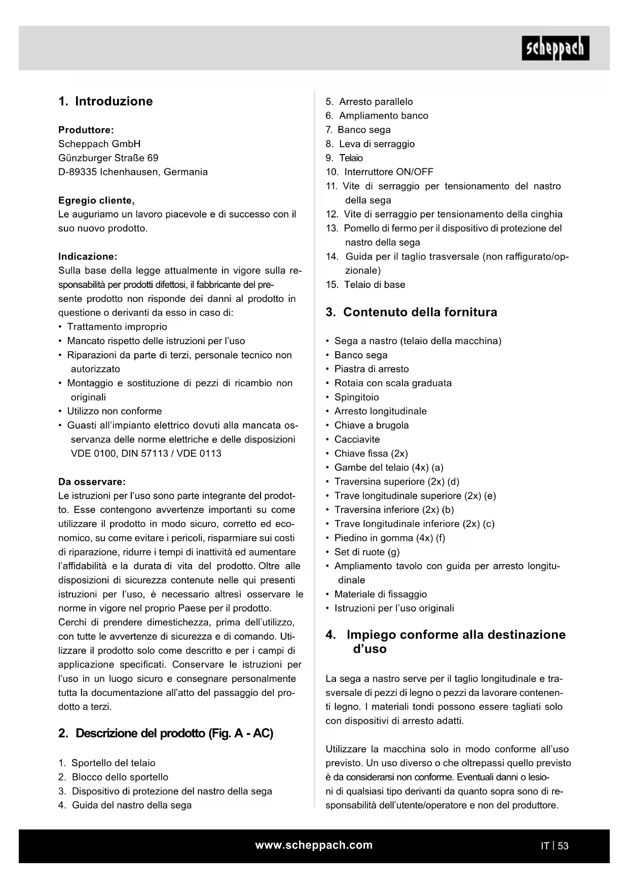 Produttore: Scheppach GmbH Günzburger Straße 69 D-89335 Ichenhausen, Germania Egregio cliente, Le auguriamo un lavoro piacevole e di successo con il suo nuovo prodotto. Indicazione: Sulla base della legge attualmente in vigore sulla re- sponsabilità per prodotti difettosi, il fabbricante del pre- sente prodotto non risponde dei danni al prodotto in questione o derivanti da esso in caso di: