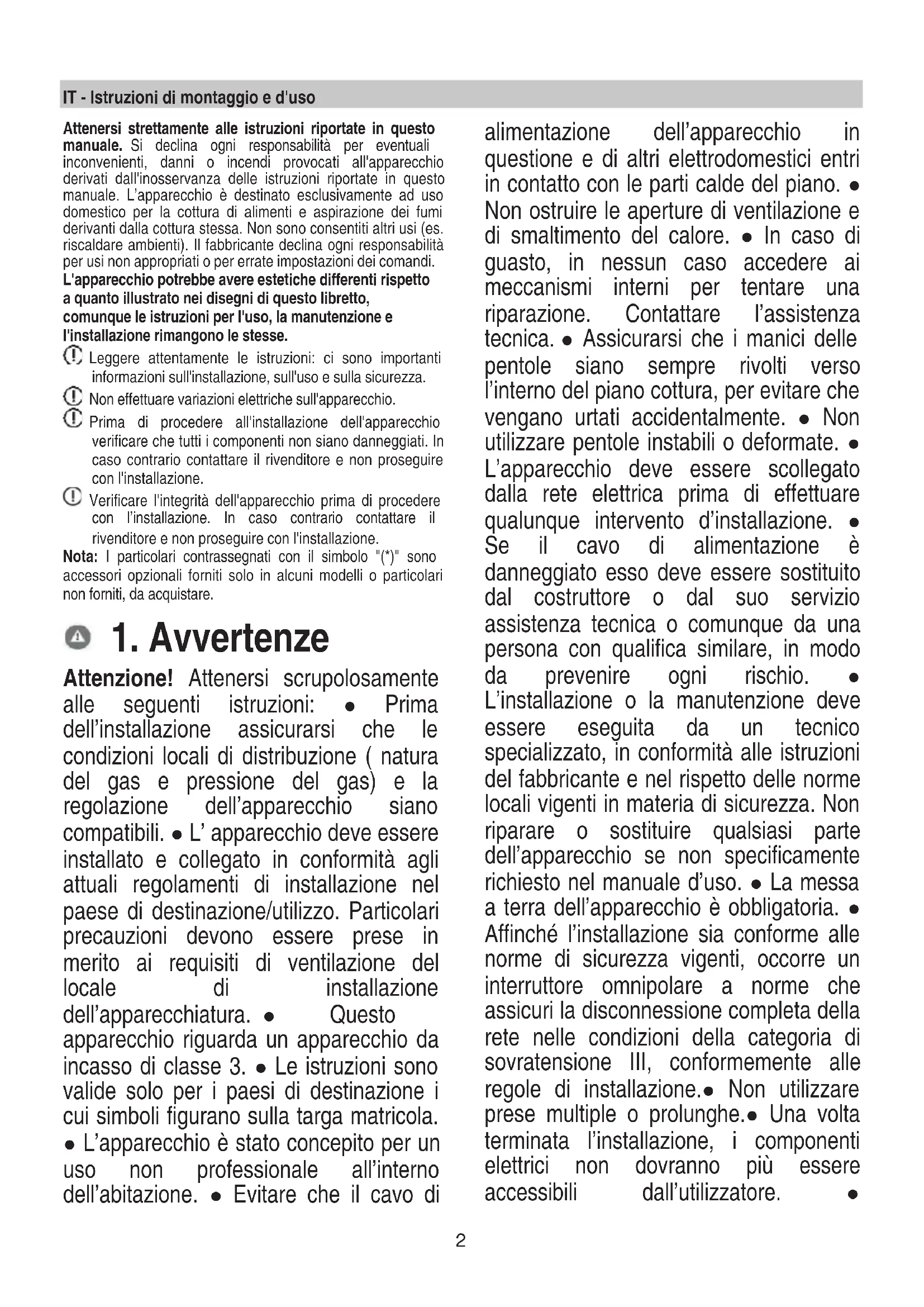 Attenzione! Attenersi scrupolosamente alle seguenti istruzioni: ● Prima dell’installazione assicurarsi che le condizioni locali di distribuzione ( natura del gas e pressione del gas) e la regolazione dell’apparecchio siano compatibili. ● L’ apparecchio deve essere installato e collegato in conformità agli attuali regolamenti di installazione nel paese di destinazione/utilizzo. Particolari precauzioni devono essere prese in merito ai requisiti di ventilazione del locale di installazione dell’apparecchiatura. ● Questo apparecchio riguarda un apparecchio da incasso di classe 3. ● Le istruzioni sono valide solo per i paesi di destinazione i cui simboli figurano sulla targa matricola. ● L’apparecchio è stato concepito per un uso non professionale all’interno dell’abitazione. ● Evitare che il cavo di alimentazione dell’apparecchio in questione e di altri elettrodomestici entri in contatto con le parti calde del piano. ● Non ostruire le aperture di ventilazione e di smaltimento del calore. ● In caso di guasto, in nessun caso accedere ai meccanismi interni per tentare una riparazione. Contattare l’assistenza tecnica. ● Assicurarsi che i manici delle pentole siano sempre rivolti verso l’interno del piano cottura, per evitare che vengano urtati accidentalmente. ● Non utilizzare pentole instabili o deformate. ● L’apparecchio deve essere scollegato dalla rete elettrica prima di effettuare qualunque intervento d’installazione. ● Se il cavo di alimentazione è danneggiato esso deve essere sostituito dal costruttore o dal suo servizio assistenza tecnica o comunque da una persona con qualifica similare, in modo da prevenire ogni rischio. ● L’installazione o la manutenzione deve essere eseguita da un tecnico specializzato, in conformità alle istruzioni del fabbricante e nel rispetto delle norme locali vigenti in materia di sicurezza. Non riparare o sostituire qualsiasi parte dell’apparecchio se non specificamente richiesto nel manuale d’uso. ● La messa a terra dell’apparecchio è obbligatoria. ● Affinché l’installazione sia conforme alle norme di sicurezza vigenti, occorre un interruttore omnipolare a norme che assicuri la disconnessione completa della rete nelle condizioni della categoria di sovratensione III, conformemente alle regole di installazione.● Non utilizzare prese multiple o prolunghe.● Una volta terminata l’installazione, i componenti elettrici non dovranno più essere accessibili dall’utilizzatore. ●3 L’apparecchiatura e le sue parti accessibili diventano calde durante l’utilizzo. Fare attenzione a non toccare gli elementi riscaldanti.● Fare attenzione che i bambini non giochino con l'apparecchio; mantenre i bambini a distanza e sorvegliarli, in quanto le parti accessibili possono diventare molto calde durante l’uso. ● Durante e dopo l’uso non toccare gli elementi riscaldanti dell’apparecchio. ● Evitare il contatto con panni o altro materiale infiammabile fino a che tutti i componenti dell’apparecchio non si siano sufficientemente raffreddati. ● Non riporre materiale infiammabile sull’apparecchio o nelle sue vicinanze. ● I grassi e gli oli surriscaldati prendono facilmente fuoco. Prestare particolare attenzione alla cottura di alimenti ricchi di grasso e di olio. ● Se la superficie è incrinata, spegnere l’apparecchio per evitare la possibilità di scossa elettrica ● L’apparecchio non è destinato ad essere messo in funzione per mezzo di un temporizzatore esterno oppure di un sistema di comando a distanza separato. ● Il processo di cottura deve essere sorvegliato. ● Non tentare MAI di spegnere le fiamme con acqua. Al contrario, spegnere l’apparecchio e soffocare le fiamme, ad esempio con un coperchio o una coperta antincendio. Pericolo di incendio: non poggiare oggetti sulle superfici di cottura. ● Non usare pulitrici a vapore. ● Prima di allacciare il modello alla rete elettrica: controllare la targa dati (posta nella parte inferiore dell'apparecchio) per accertarsi che la tensione e potenza siano corrispondenti a quella della rete e la presa di collegamento sia idonea. In caso di dubbio interpellare un elettricista qualificato. Importante: ● Dopo l'uso, spegnere il piano di cottura tramite il suo dispositivo di comando. ● Per evitare le fuoriuscite di liquido ridurre l’alimentazione di calore. ● Non lasciare gli elementi riscaldanti accesi con pentole e padelle vuote oppure senza recipienti. ● Una volta terminato di cucinare, spegnere la relativa zona. ● Non lasciare mai pentole vuote sugli elementi riscaldanti in funzione. ● Non utilizzare recipienti che fuoriescono dai bordi del piano. ● ATTENZIONE! In caso di rottura del piano in vetro: ● 1) spegnere immediatamente tutti i bruciatorie isolare l’apparecchio dall’alimentazione. ● 2) non toccare la superficie dell’apparecchio