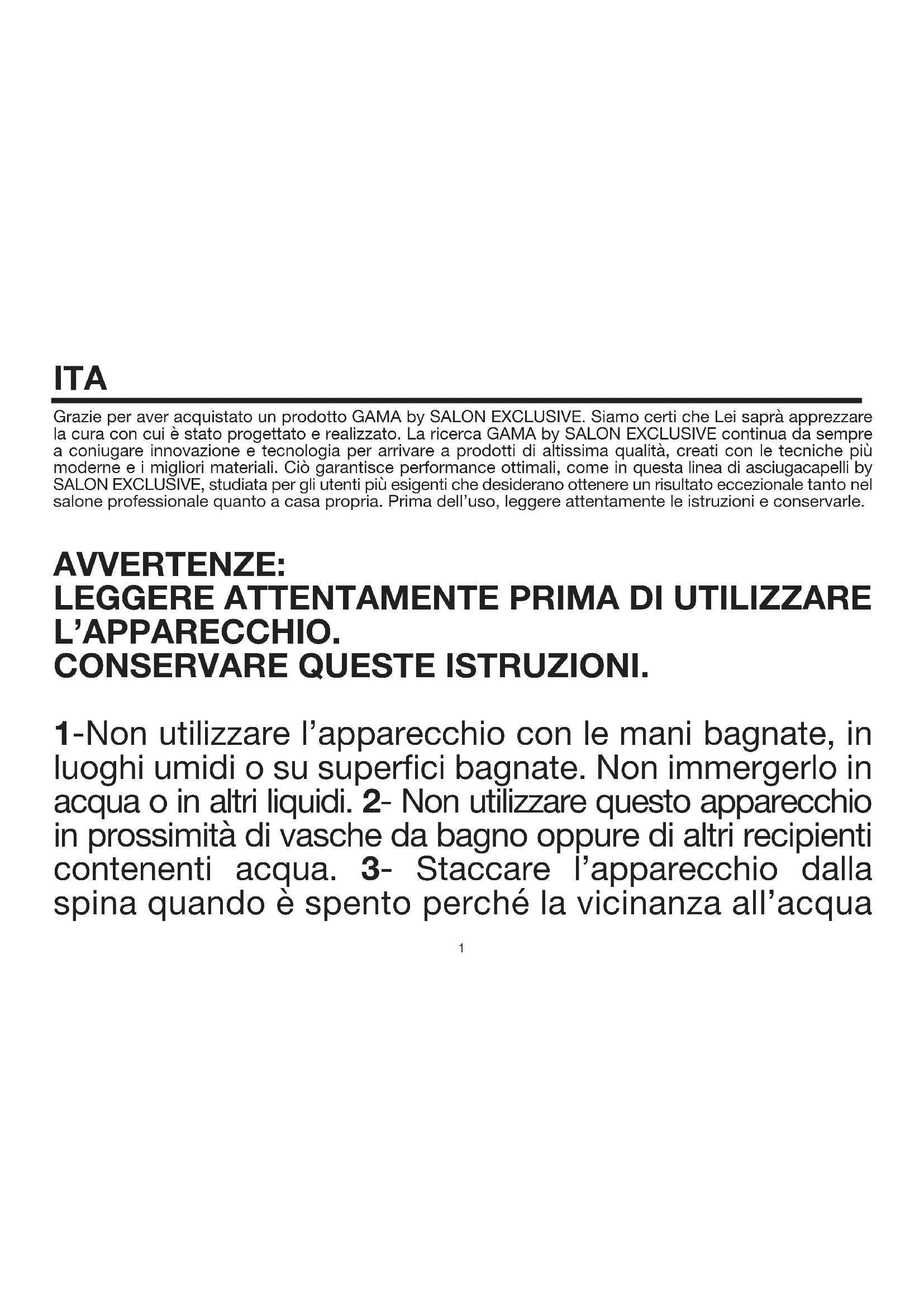www.gamaprofessional.com / info@gama.eu LINEITA Grazie per aver acquistato un prodotto GAMA by SALON EXCLUSIVE. Siamo certi che Lei saprà apprezzare la cura con cui è stato progettato e realizzato. La ricerca GAMA by SALON EXCLUSIVE continua da sempre a coniugare innovazione e tecnologia per arrivare a prodotti di altissima qualità, creati con le tecniche più moderne e i migliori materiali. Ciò garantisce performance ottimali, come in questa linea di asciugacapelli by SALON EXCLUSIVE, studiata per gli utenti più esigenti che desiderano ottenere un risultato eccezionale tanto nel salone professionale quanto a casa propria. Prima dell’uso, leggere attentamente le istruzioni e conservarle. AVVERTENZE: